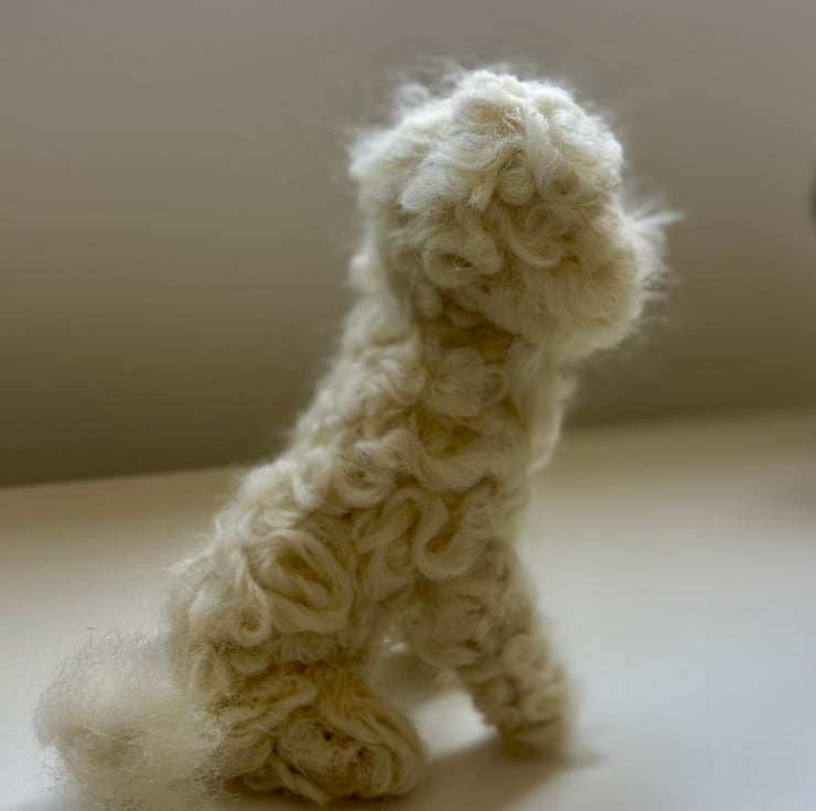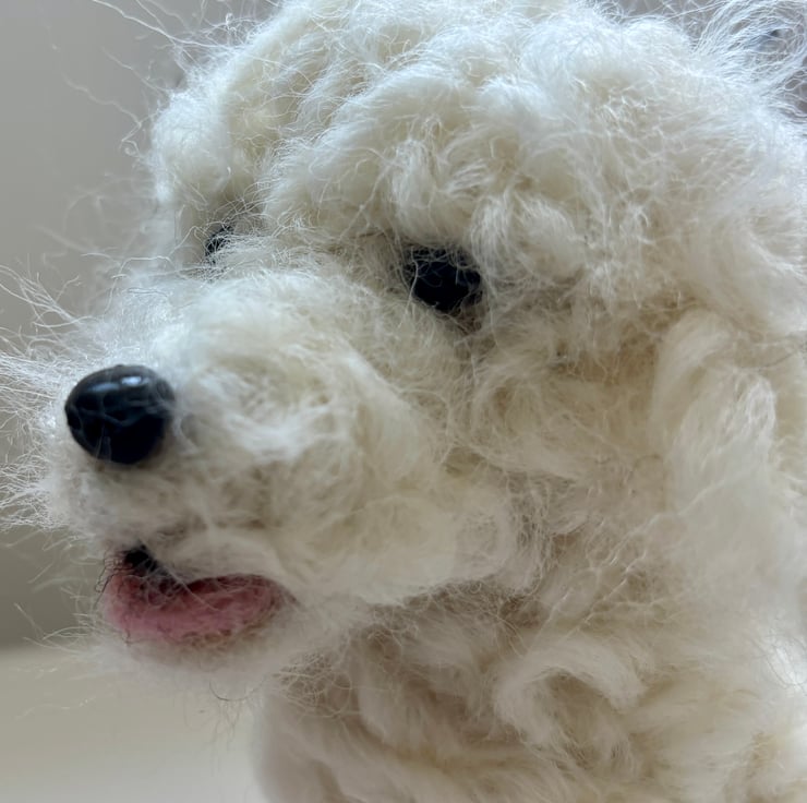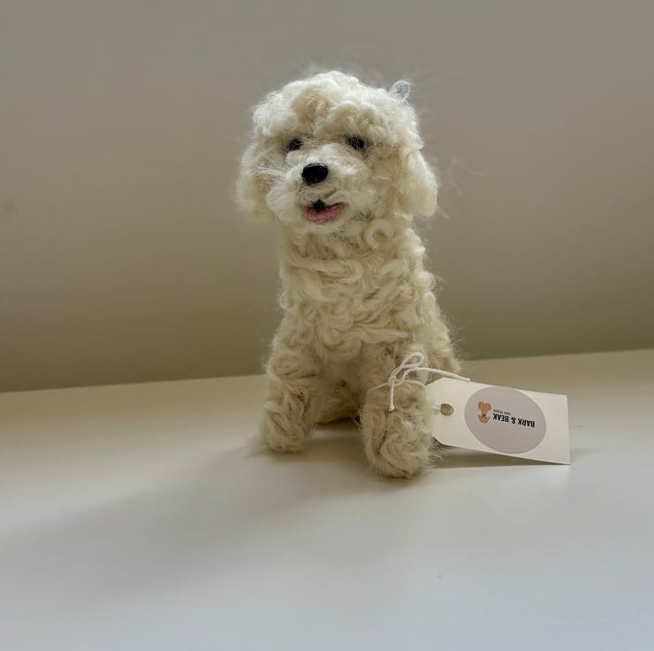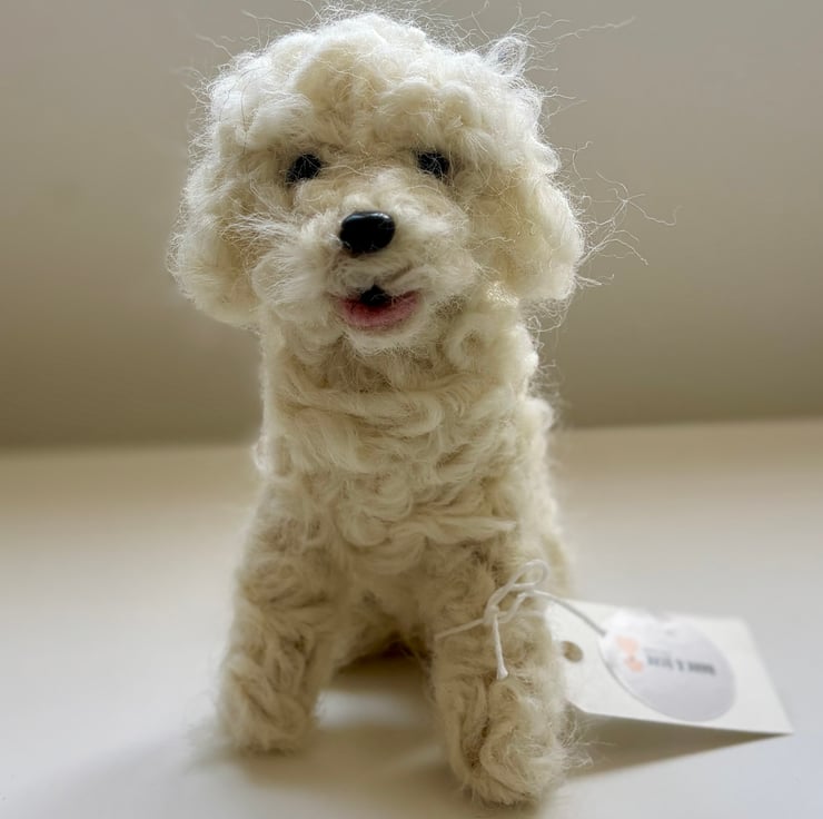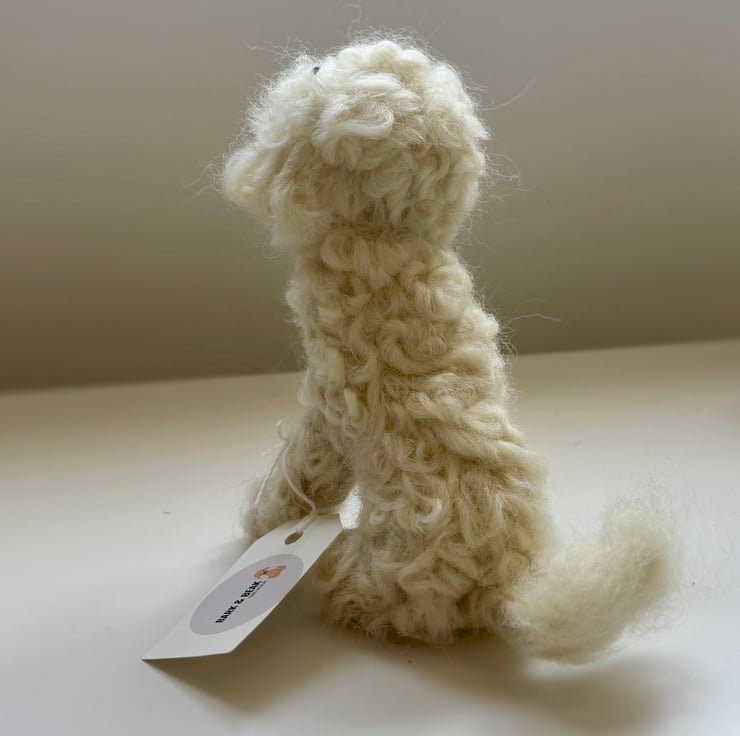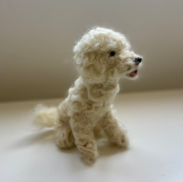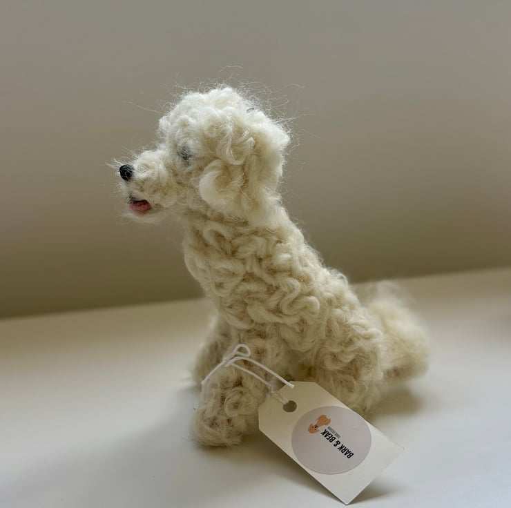 A charming little white curly haired dog. I love dogs and poodle breeds and trying to capture their cheeky spirit through felting