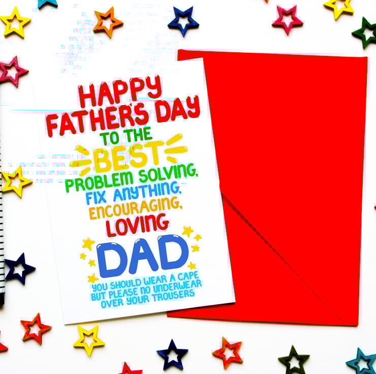 Greeting on front: HAPPY FATHER'S DAY TO THE BEST PROBLEM SOLVING, FIX ANYTHING, ENCOURAGING, LOVING DAD YOU SHOULD WEAR A CAPE BUT PLEASE NO UNDERWEAR OVER YOUR TROUSERS