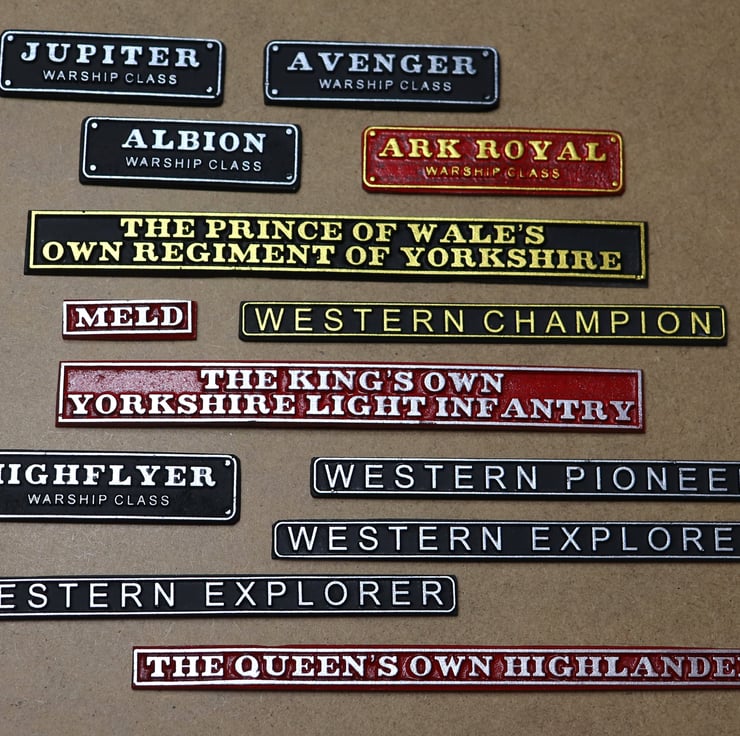B.R. £8 each. This includes all BR shape nameplates including Diesels.E.G.THE PRINCE OF WALES OWN REGIMENT OF YORKSHIRE SCALES TO 155MM X 15MM (2 rows of text) and WESTERN INVADER, 115mm wide and CHAMPION, 55 x 16mm (Warship) to maintain the 1/17th scale
