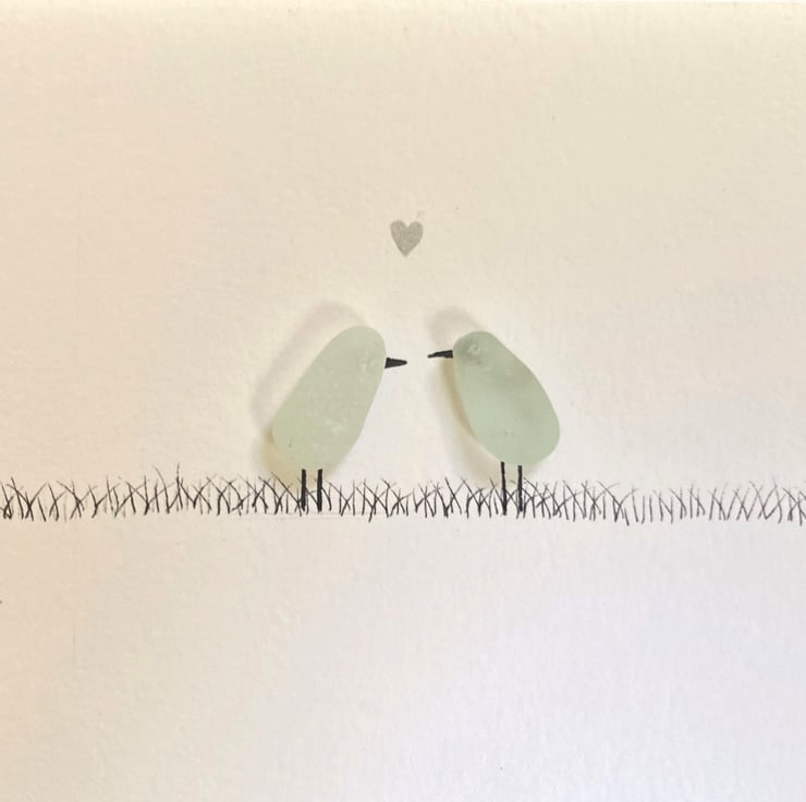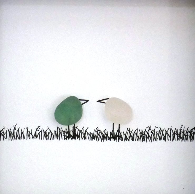 LOVE BIRDS - A strikingly simple yet elegant handmade to order picture using hand picked sea glass. This picture can be personalised with names or a message at the bottom of the picture. A perfect and unique gift for a range of occasions; for a loved one or an anniversary; to mark an engagement or wedding or a birthday gift for a friend or family member. This picture will be framed for you in either in a 15 cm x10 cm (6x4 inch) or a 18 cm x 13 cm (7x5 inch) frame. Every pebble, piece of sea glass, shell, piece of driftwood or other natural materials are UNIQUE which means that your purchase will be too! The sea glass love birds may vary in colour from the image seen but the picture will remain faithful to the design.