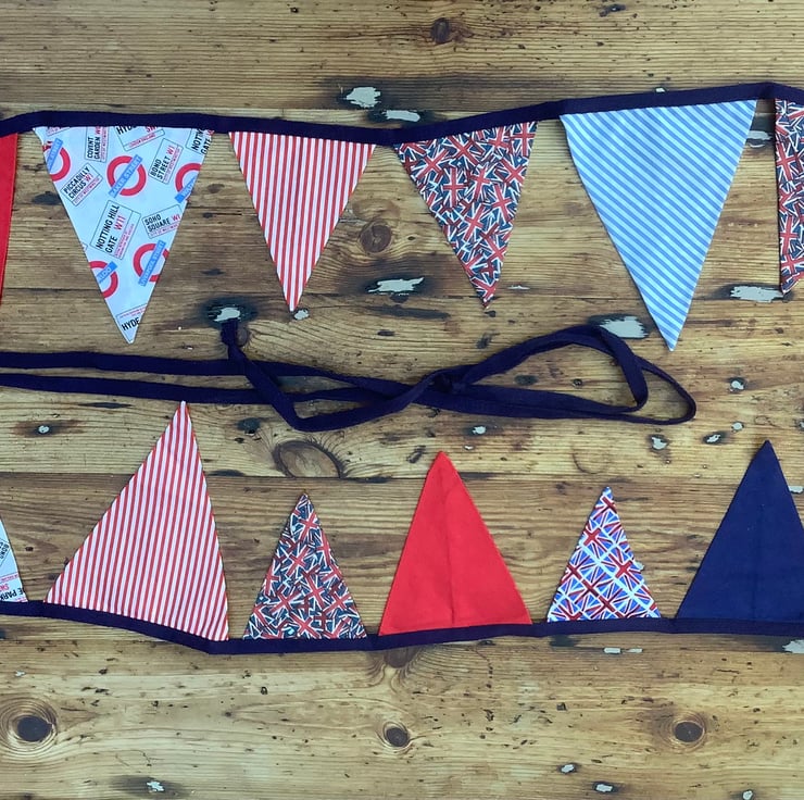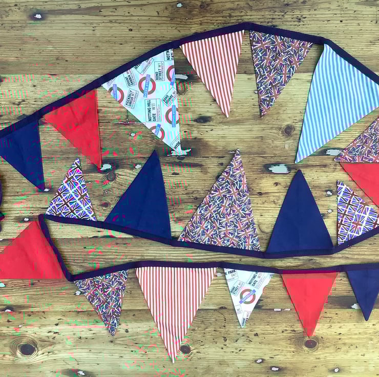 Handmade fabric cotton flags bunting with Union Jacks, London Street signs, London tube names and fun red, white and blue flags.