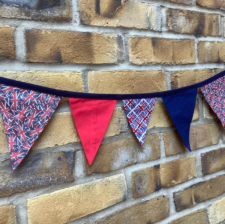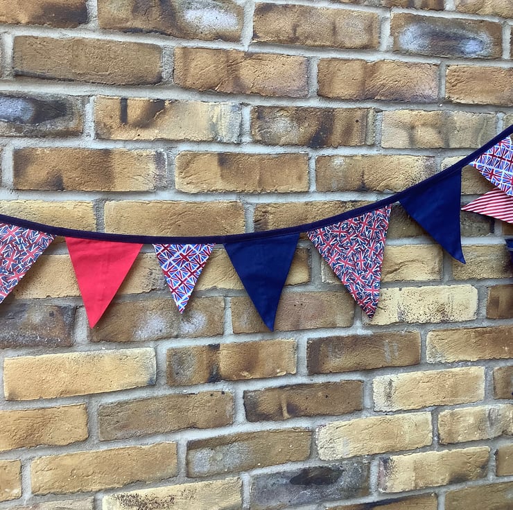 A one off set of bunting on sturdy navy cotton heading tape which has been doubled over and stitched for extra strength.