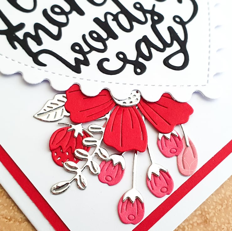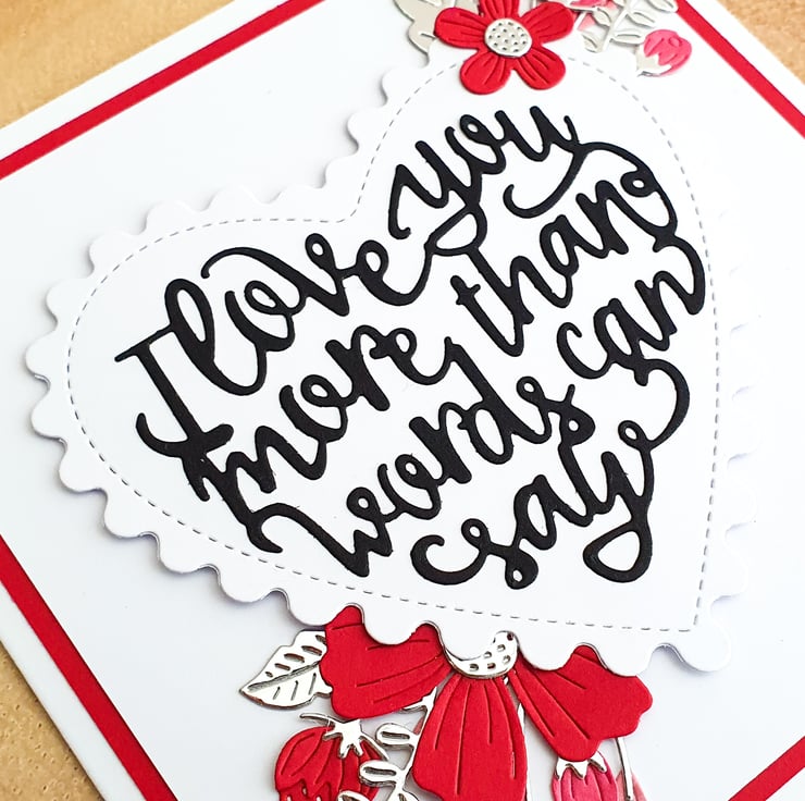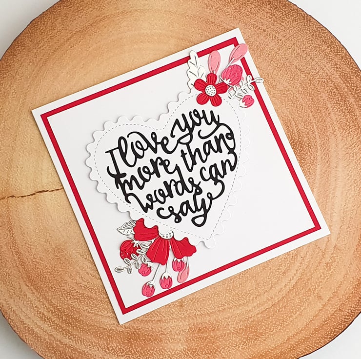 This design features a spray of pink and red flowers with silver leaves and foliage, on a white background. The large sentiment on the heart reads "I love you more than words can say" in script lettering