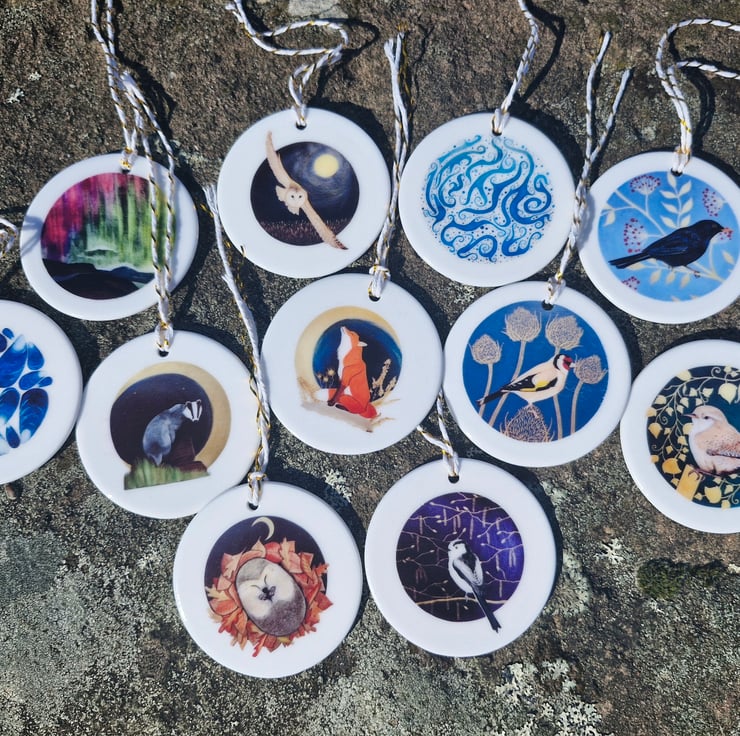 Approx 7cm in diameter. A ceramic hanging bauble printed with an original artwork by Hannah MacIver.