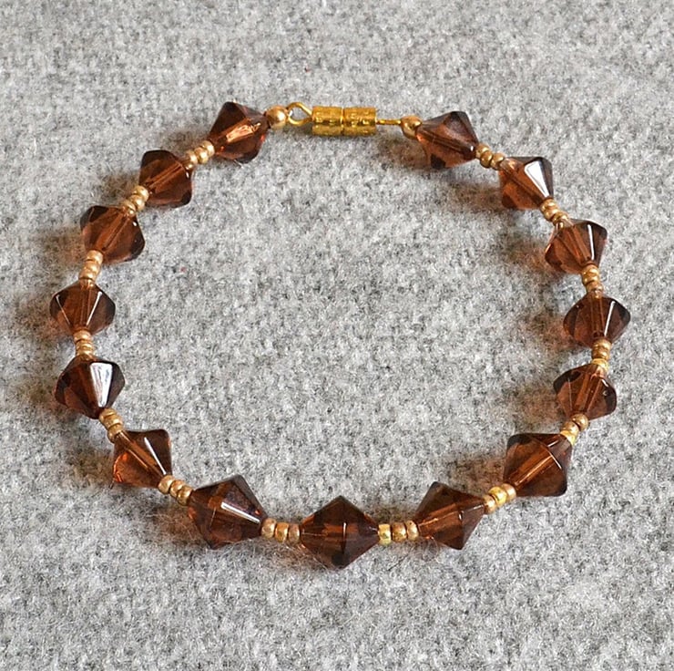 The combination of chestnut brown glass bicone beads and gold seed beads give this bracelet a classic look. The bracelet measures approximately 20.5cm (8 inches) and is finished with a gold-plated barrel clasp.