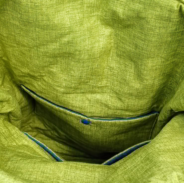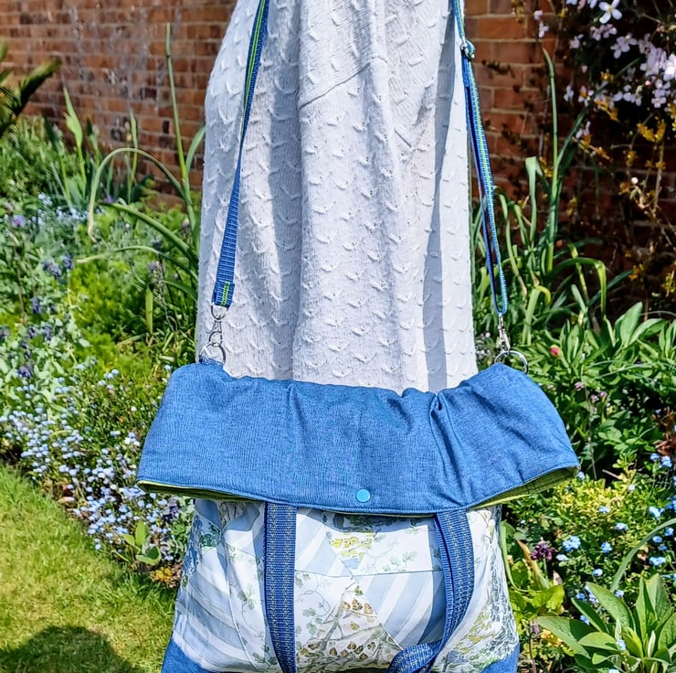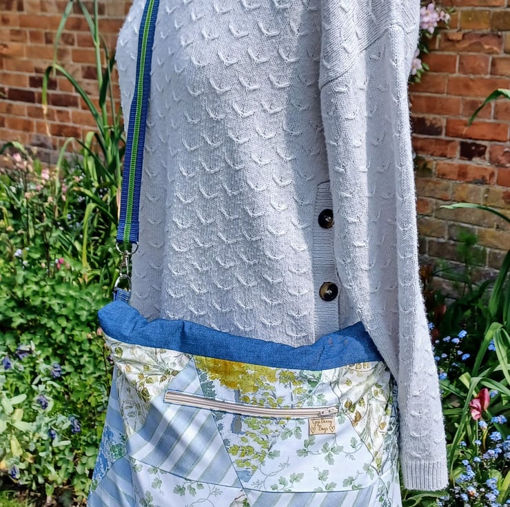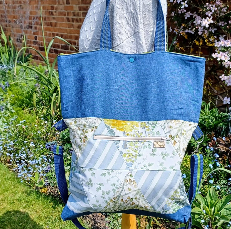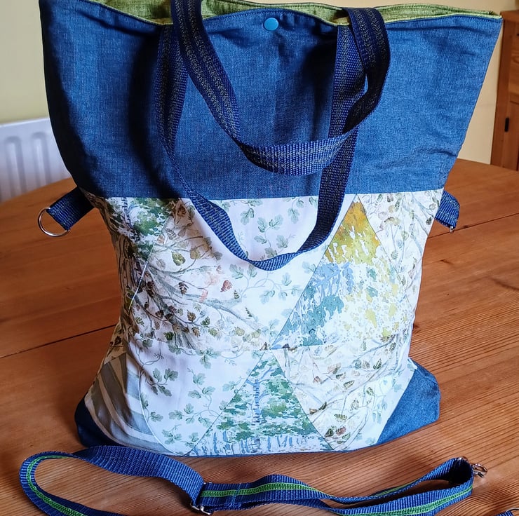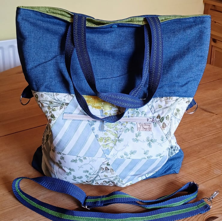 This beautiful bag is effectively 3 bags in one! It can be used as a large shoulder bag or tote bag or, if you remove the shoulder strap you can turn it into a shopping bag - probably the most versatile bag you will ever own! Apart from its versatility it is also beautifully made with patchwork triangle panels on both sides and top and bottom in contrasting fabric. The long adjustable (removable) strap has a contrasting green ribbon detail stitched onto it and the handles have been stitched with a green leaf detail. Whilst the front of the bag (which folds over when used as a shoulder/tote bag) features the patchwork design alone, the other side also has a large zip pocket so your phone and keys stay handy without having to dive into the depths of the bag and search through your shopping, and the top of the bag is finished with a blue snap fastener to keep the bag closed once full. Inside, the bag is lined with a green contrasting fabric and features more pockets for all your other essentials that need easy access. Measurements approx: width: 16"; height: 19" (when fully extended, excluding handles), 13" when folded over; bottom width 3".