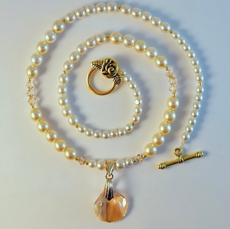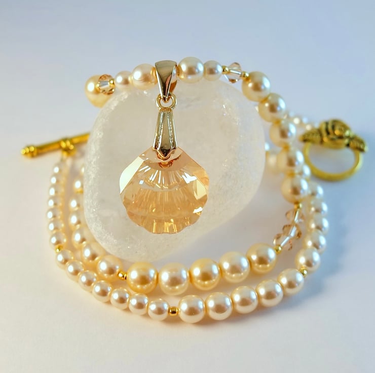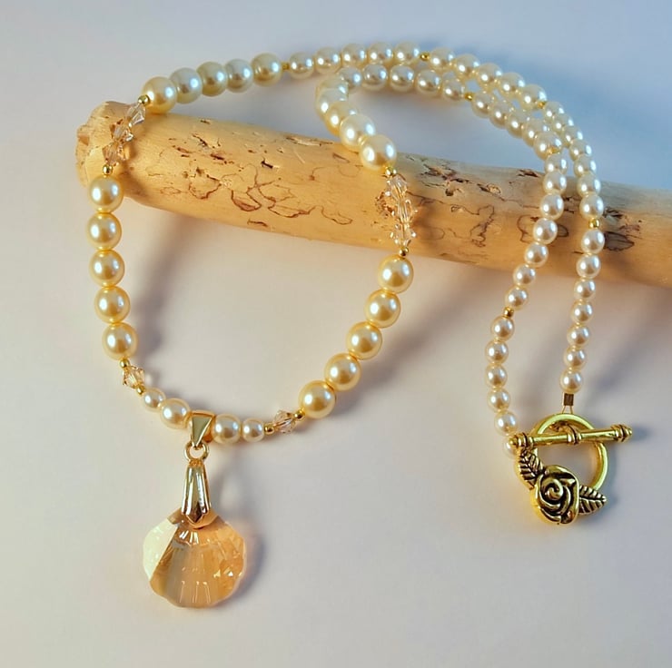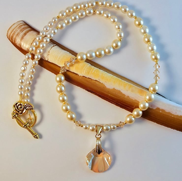 It hangs between graduated 6,5 and 4mm Czech glass pearls with 'golden shadow' crystal bicones for extra sparkle, and highlighted with tiny gold vermeil spacer beads.