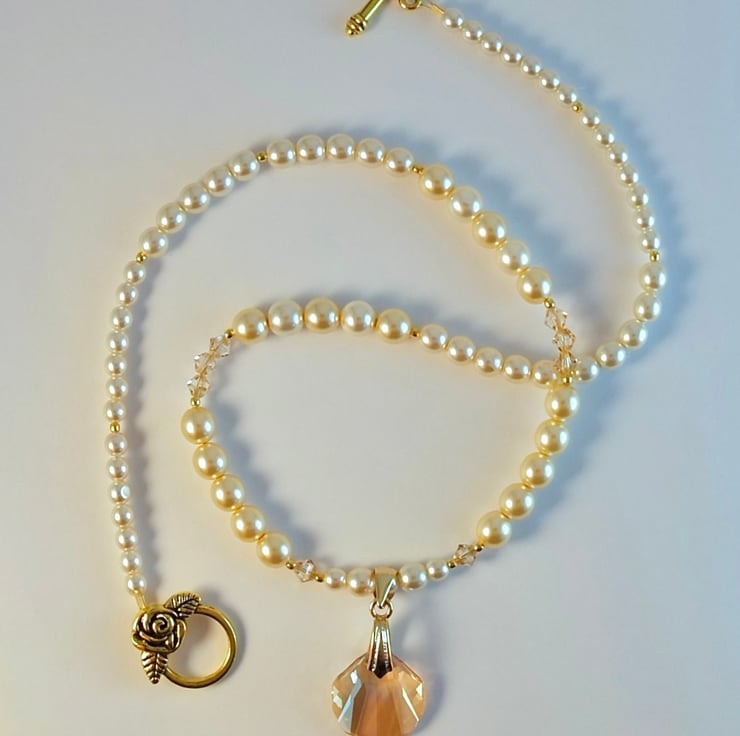 This delicate necklace has a lovely, creamy satin sheen from the pearls and a beautiful sparkle when the crystal catches the light.
