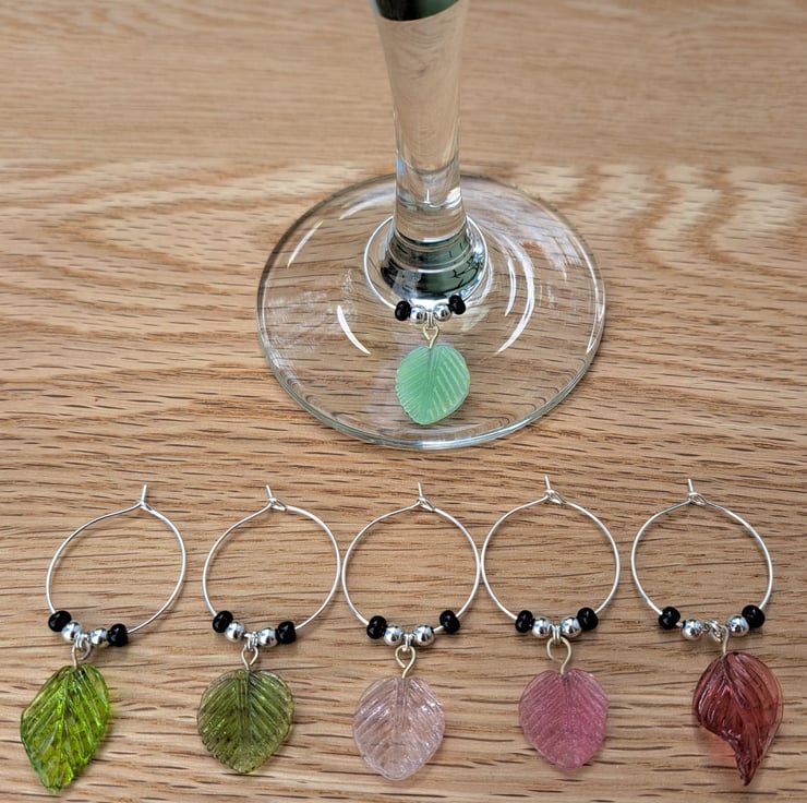 The glass leaf charms, paired with black and silver seed beads, are a cute way for your guests to tell whose drink is whose. They’re set on 25mm diameter silver-plated wire loops, which fasten with a pin and loop for simple and secure use.
