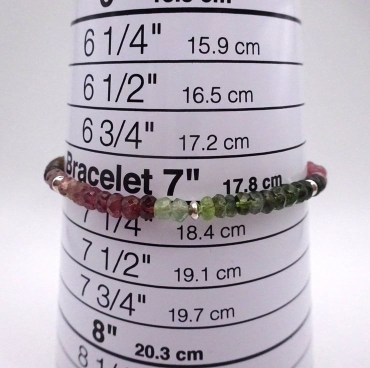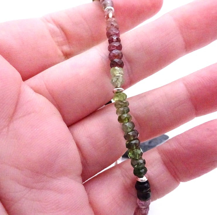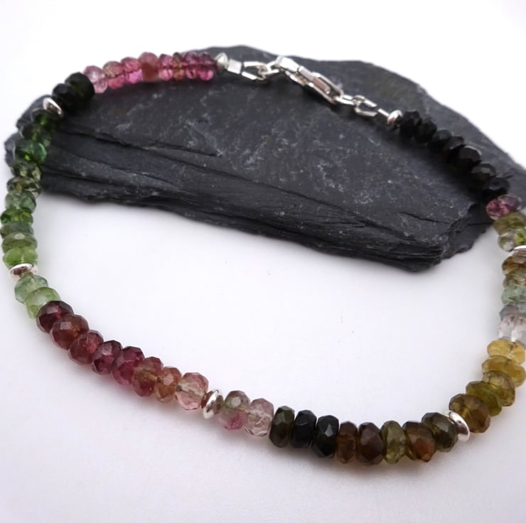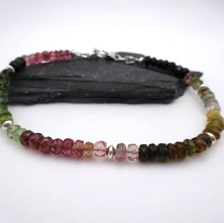 A beaded bracelet made with Grade AA Multi Tourmaline gemstone beads and sterling silver beads.