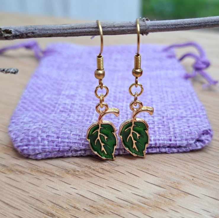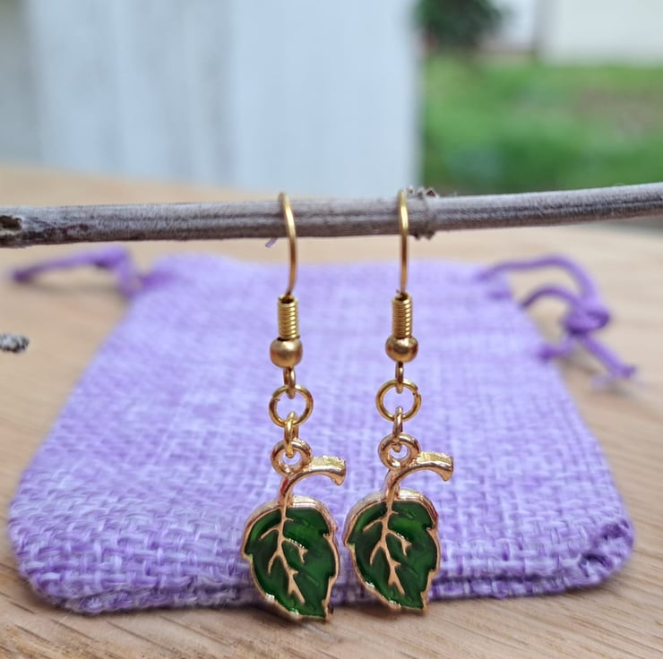 These green leaf earrings with gold-coloured veins and outline, are pretty and subtly shiny. They’re hung on nickel free gold-plated ear wires. Cute for everyday wear or a nature themed outfit.