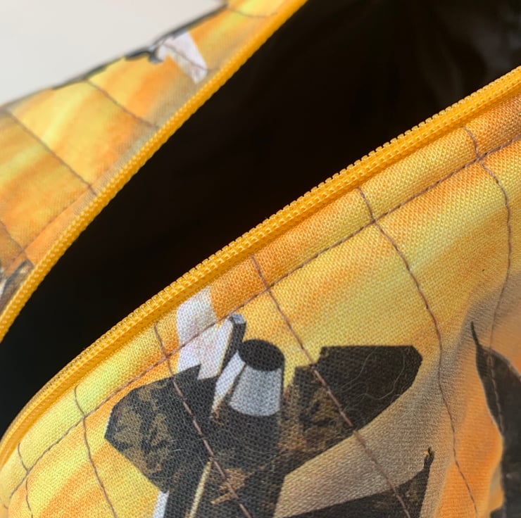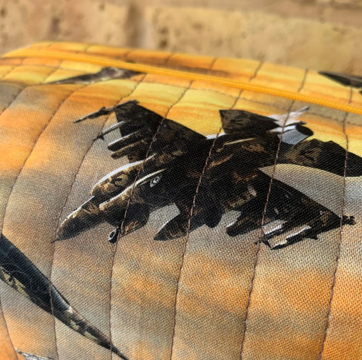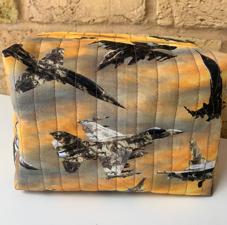 The box shape wash bag is made in this striking fighter jet design cotton fabric.