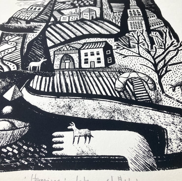 Like all of my donkey adventure prints I decided to try and create a secret world that only donkeys know about. In many of the prints, 'helping hands' appear, to assist the donkeys if they get stuck. I like to celebrate donkeys in my art and put the spotlight on them for a change. It doesn't happen enough.