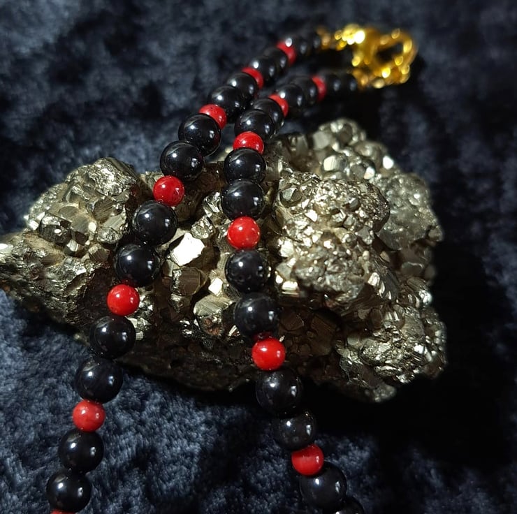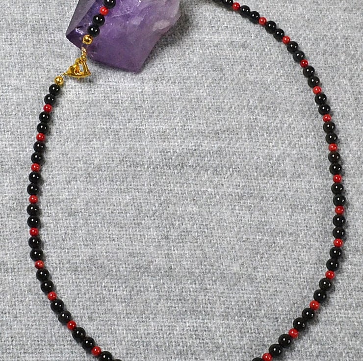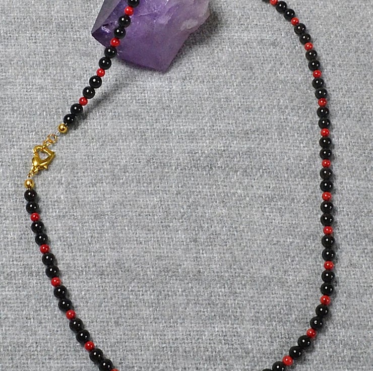 A simple but eye-catching piece. This attractive necklace is made from 4mm black glass beads and 3mm red glass beads, strung on beading wire and finished with a gold-plated clasp. The necklace is approximately 51cm (20 inches).