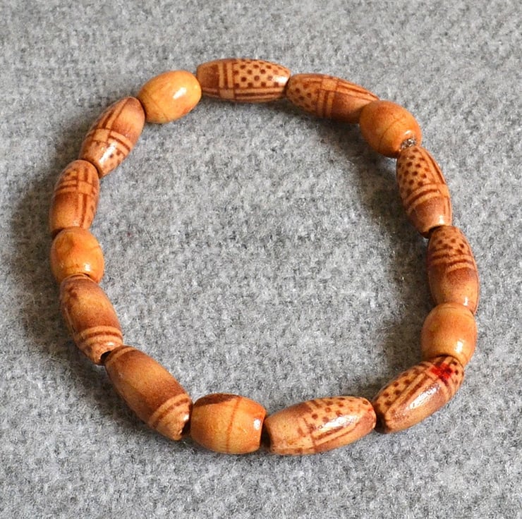 The wooden barrel and cylinder beads that make up this lightweight bracelet are printed with a pretty and irregular pattern. They are strung on jewellery elastic for an easy fit. The approximate unstretched length of the bracelet is 20cm (8 inches).