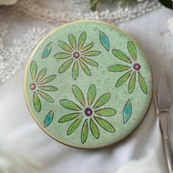 This terracotta flower pot measures 6” high and has been painted in a beautiful pale green. It has been embellished with hand drawn flowers and petals in white, black and gold.