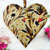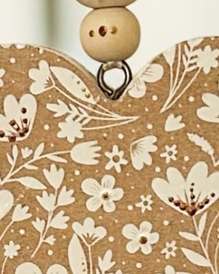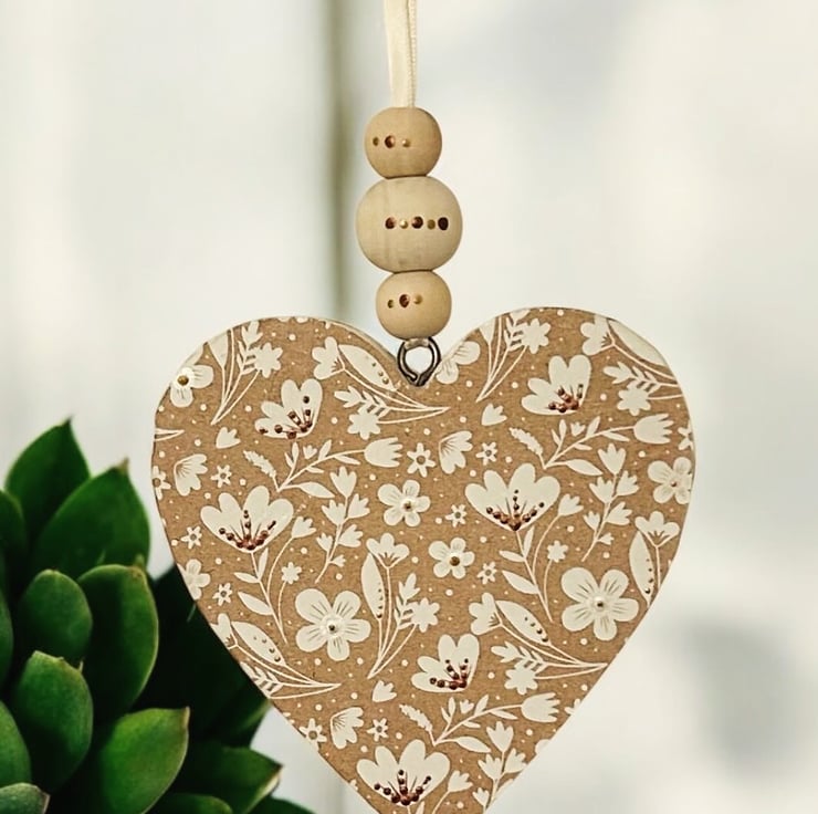 This wood heart has been decoupaged with a pretty pale brown and white floral paper. It has been embellished with painted metallic dots. It hangs from a cream satin ribbon with dotted wooden beads.