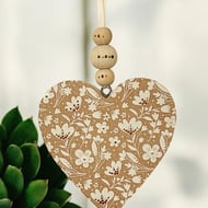 This wood heart has been decoupaged with a pretty bird and leaf paper. It has been embellished with painted metallic dots. It hangs from a jute cord.