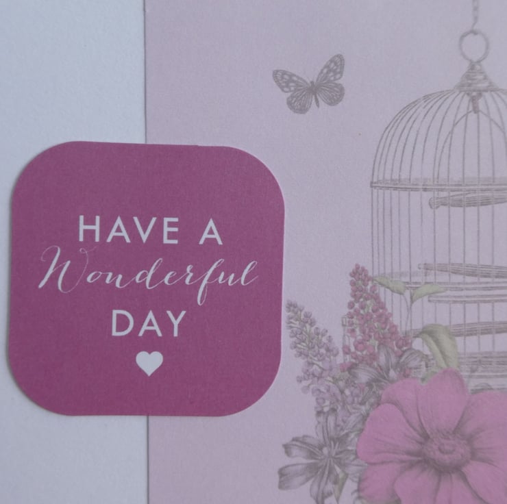Inside the card is a strip of matching soft pink paper with an image of a bird cage, flowers and butterflies. A pink square message with the words Have A Wonderful Day in white has been added to complete the design. Plenty of space has been left for your own birthday message.