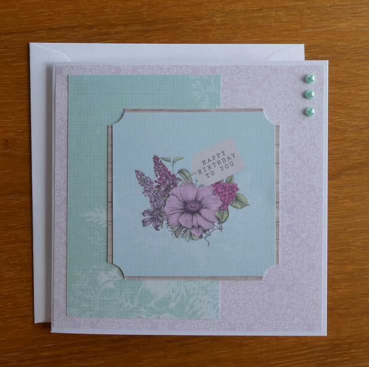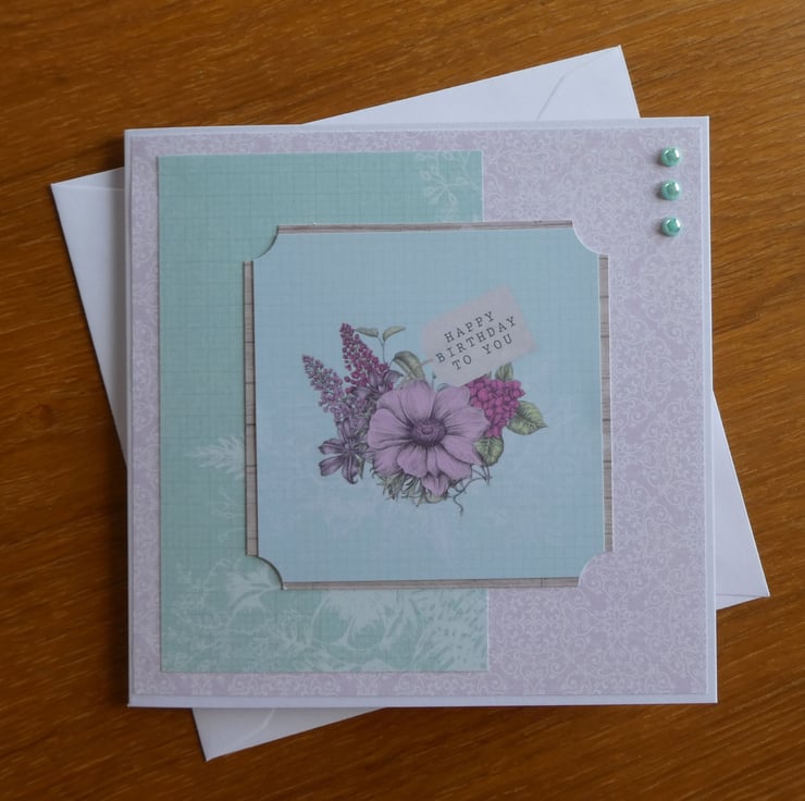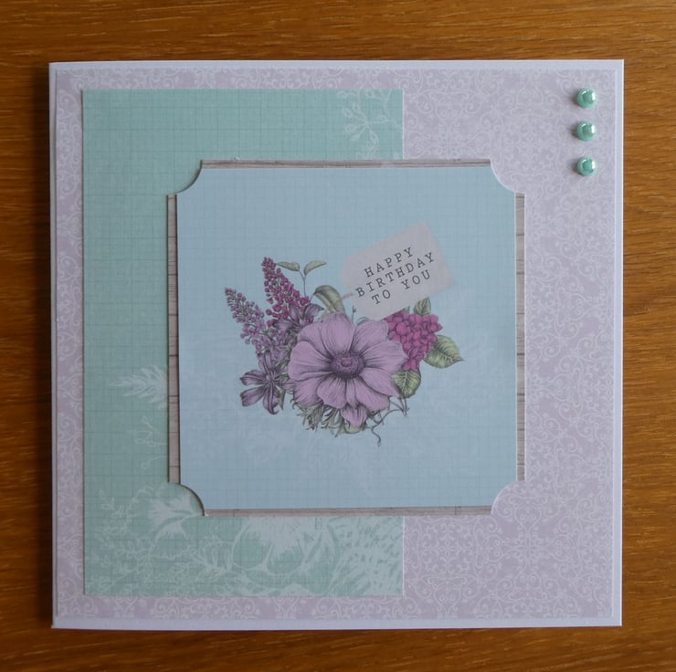 A central square topper with an image of pink and soft purple flowers on an aqua background has the message Happy Birthday To You. This has been mounted on a soft brown wood effect layer to frame it.