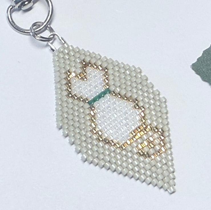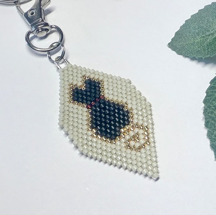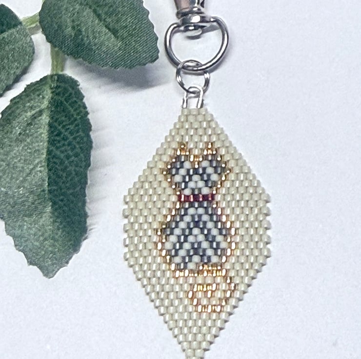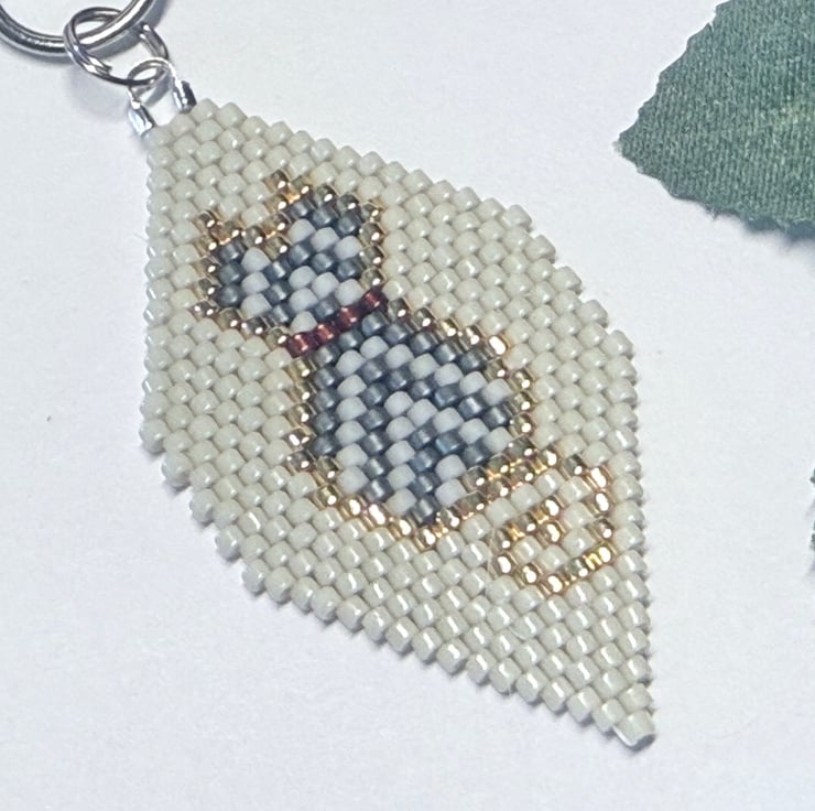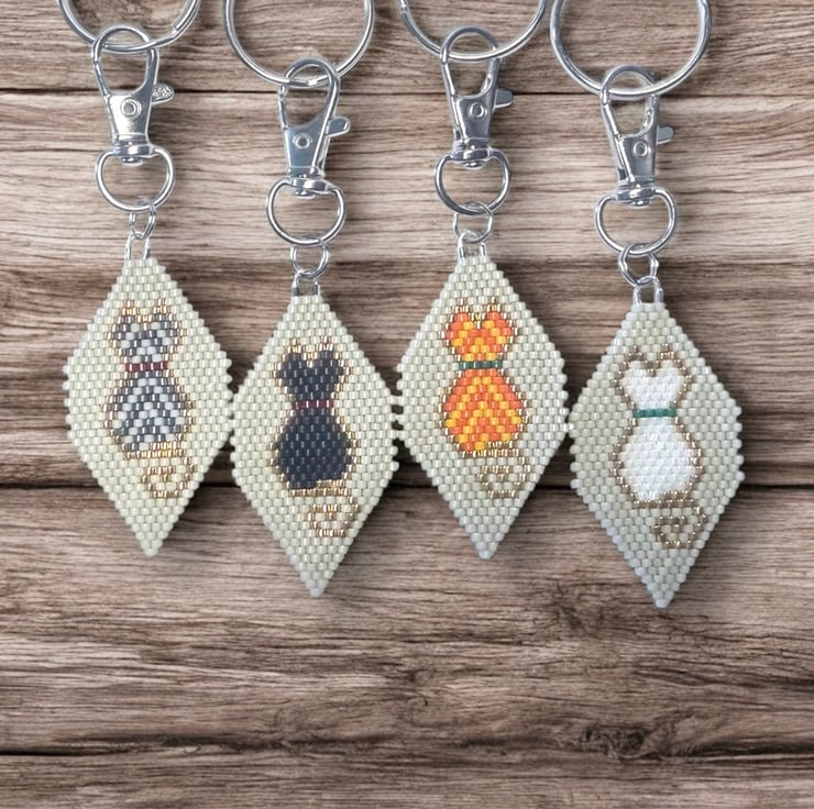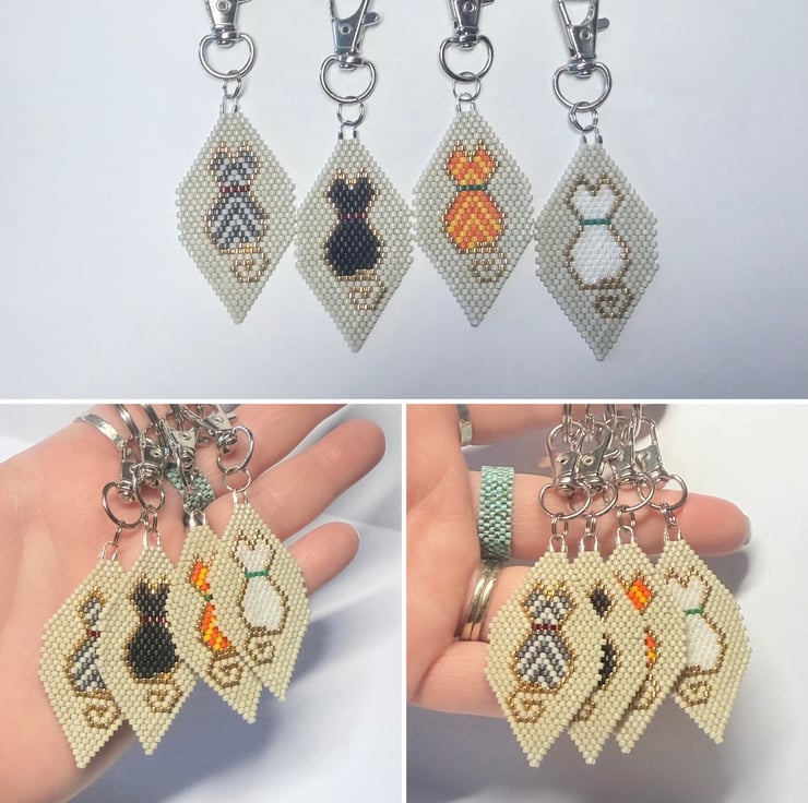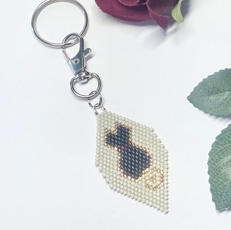 This handmade bead woven keyring, bag charm features a stylized cat design. The cat sits upright and facing away on a pale beige background. There are 4 different coloured cats to choose from:
