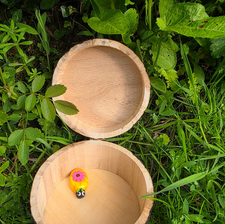 Hand decorated wooden keepsake box box featuring polymer clay love bugs, leaves and flowers.