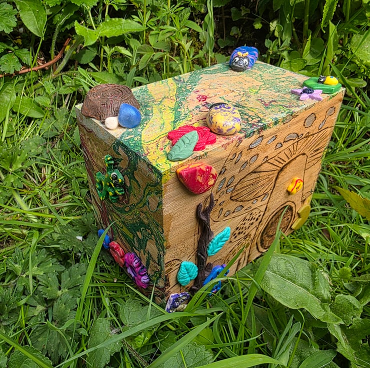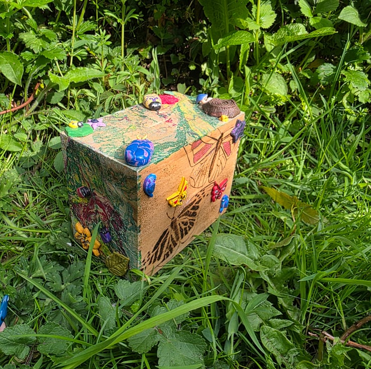 Hand decorated money box featuring pyrography designs and polymer clay love bugs and wildlife