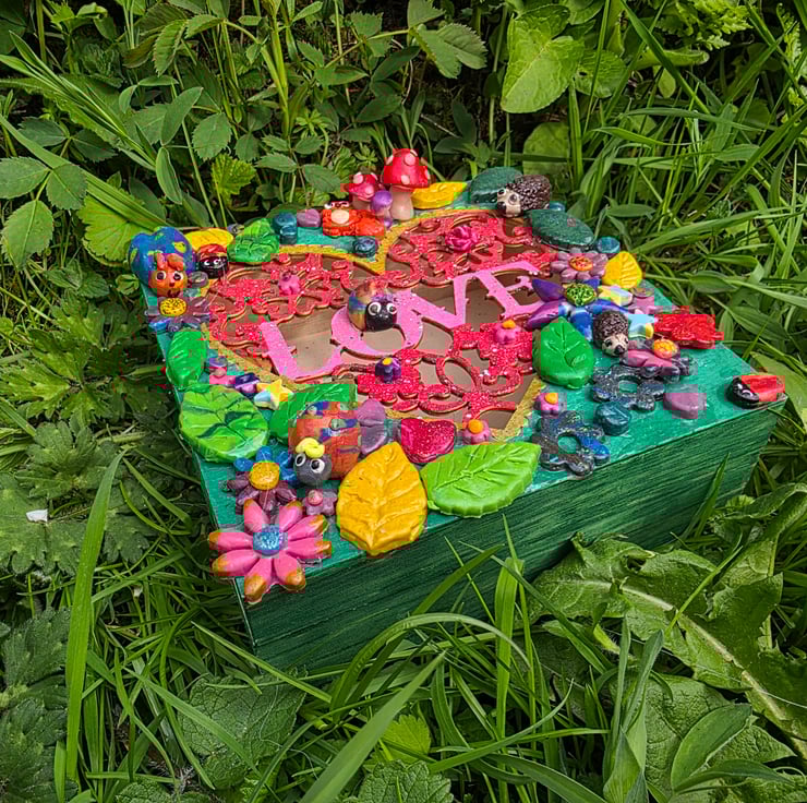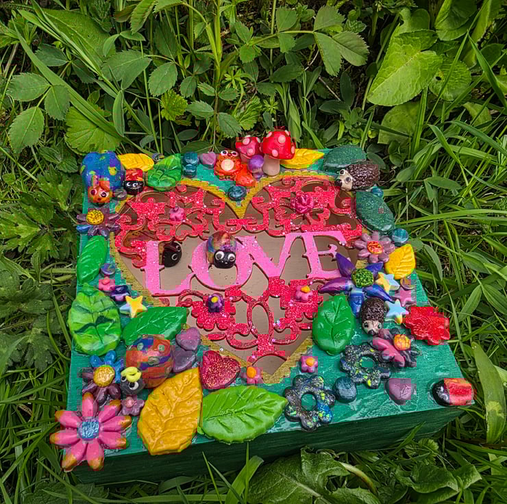 Hand painted and decorated wooden box featuring the word Love and polymer clay Bugs, flowers and wildlife