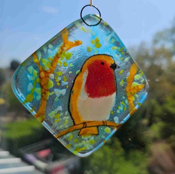 This Robin loves the light and hangs happily in a window or against a wall. It is made from fused glass and is about 6cm square. It arrives in a card slip case, perfect for wrapping or posting on.