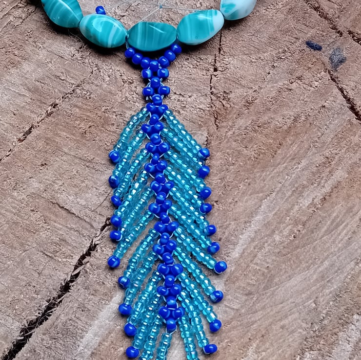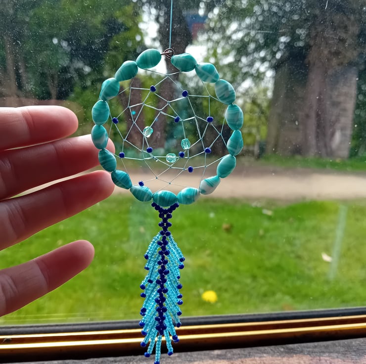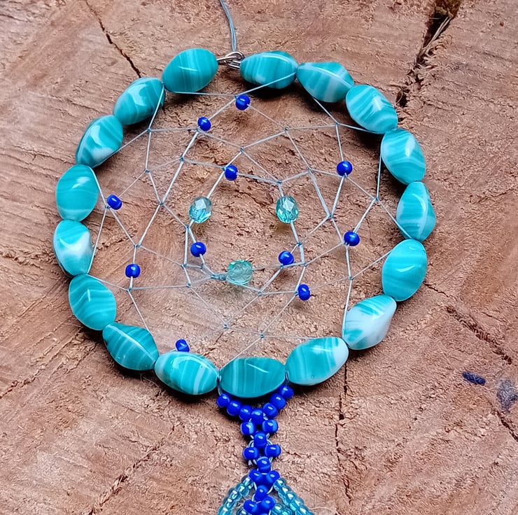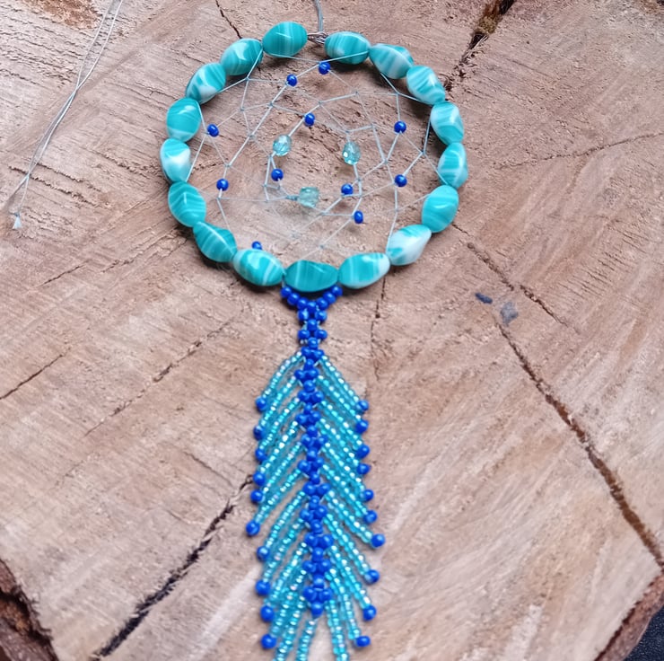 The dream catcher is adorned with a beautiful 7cm beaded feather made from shimmering ice blue and royal blue seed beads.