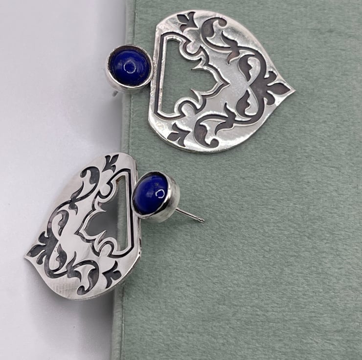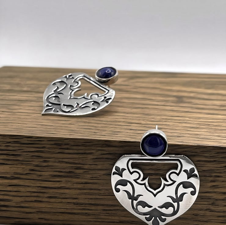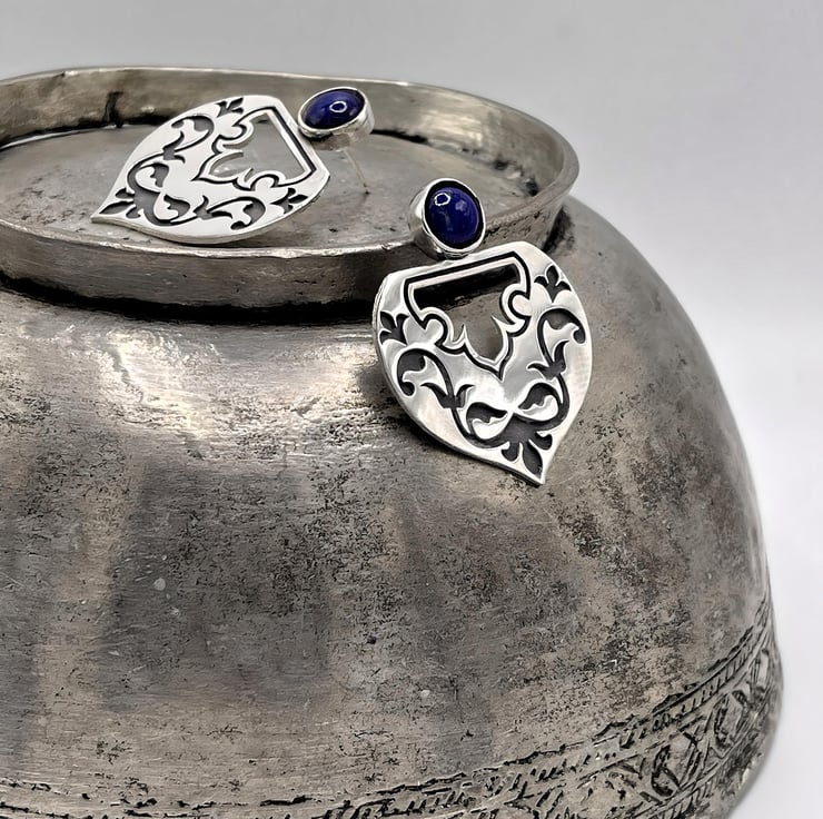 Our Lapis embellished persian earrings are one of our statement pieces. These elegant “Lapis-Embellished Persian Earrings” are a stunning fusion of traditional Persian artistry and modern design. Crafted from Sterling silver 925, each earring features an intricate design adorned with black oxidised floral and geometric motifs, symbolising ancient Persian patterns. At the top, a brilliant blue lapis lazuli cabochon adds a touch of sophistication. Lapis lazuli represents wisdom, truth, and spiritual enlightenment. These earrings are not just accessories but wearable art, capturing the essence of Persian heritage with a contemporary twist.