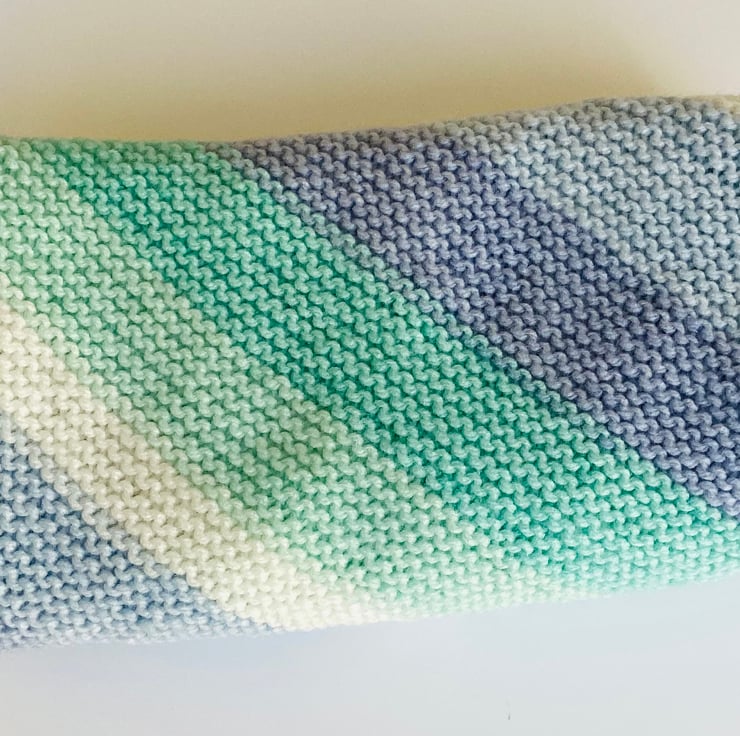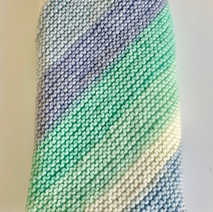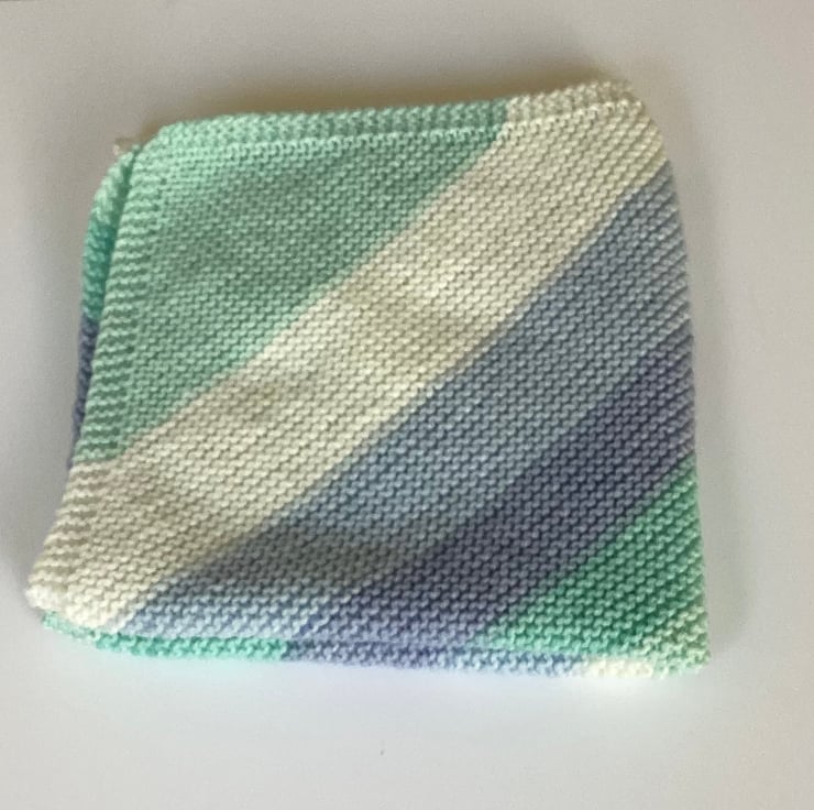 Lovely little baby blanket hand knitted by me in my Suffolk home. I have used a top quality baby aran yarn in gorgeous shades of blues, mint greens and cream and is very soft and cuddly for your baby. It has been knitted from corner to corner and is the perfect size to use with a car seat,crib or pram, measuring approximately 64cm square.
