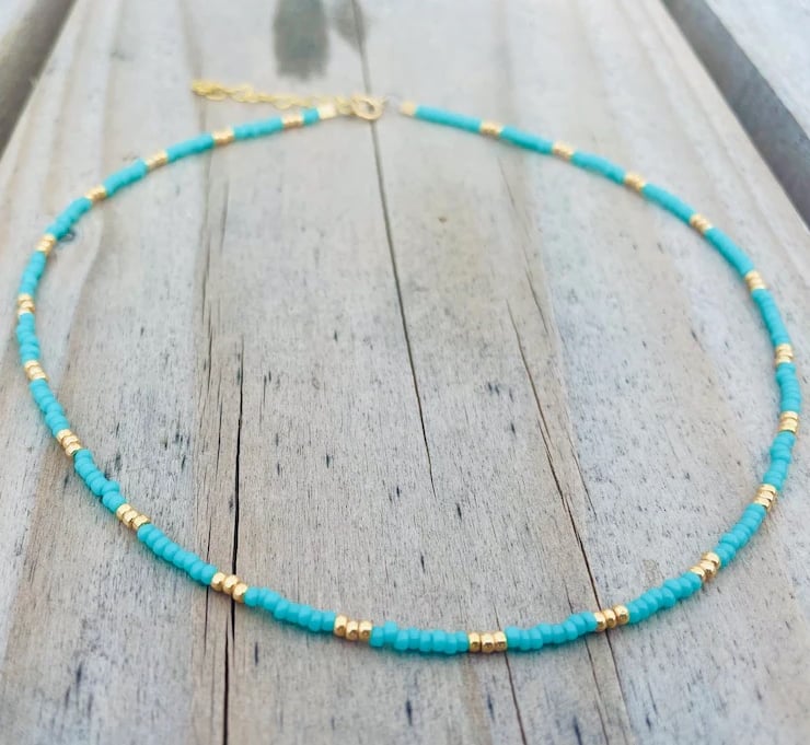 Turquoise 3mm, beaded anklet with tiny gold seed beads and 14k gold fill clasp and one inch gold vermeil heart extension chain . Measures 8,5 inches plus an extra inch extension chain so can be worn up to 9.5 inches , larger sizes can be made at an extra cost so please ask.