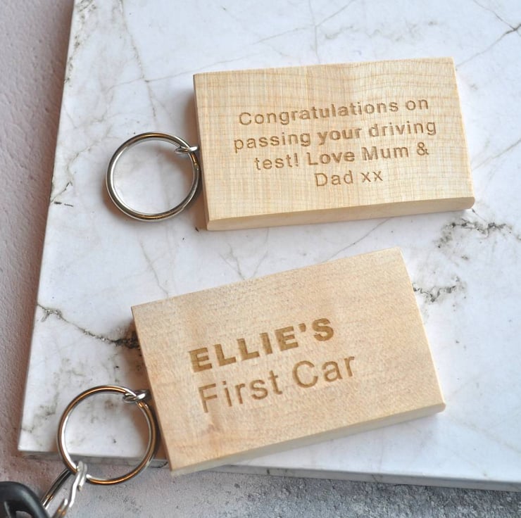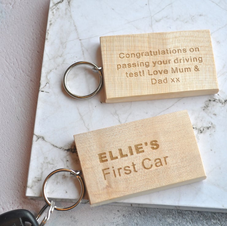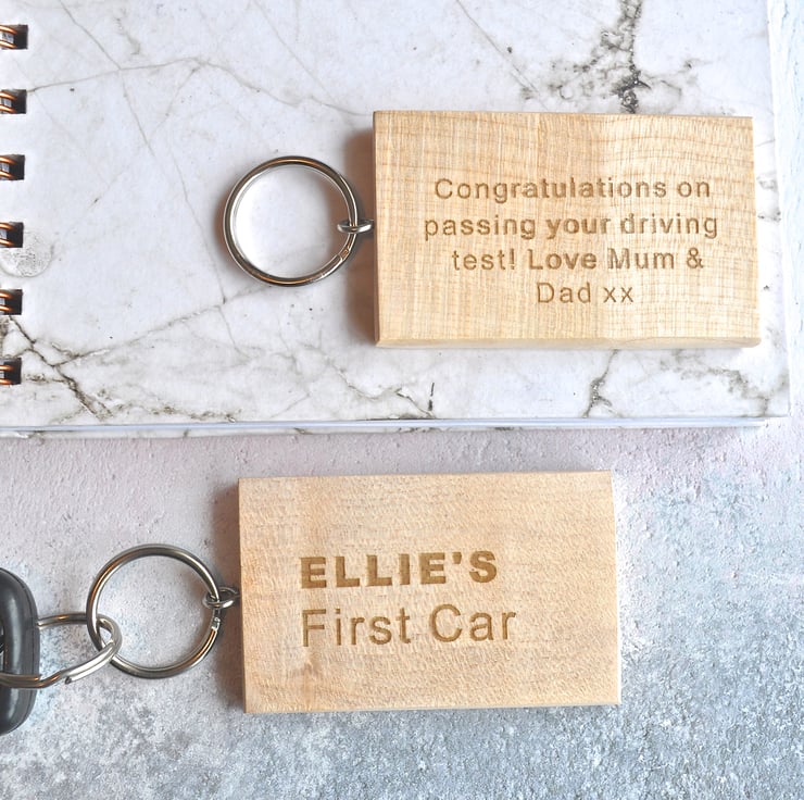 A wooden keyring personalised with the name of your choice and 'First Car'. The perfect gift for someone who has just passed there driving test!