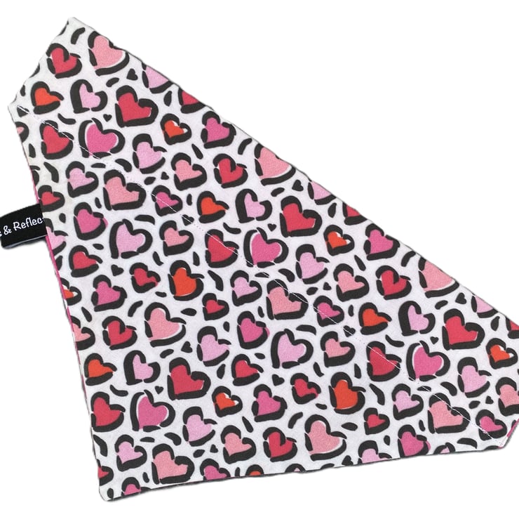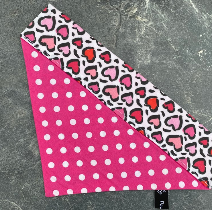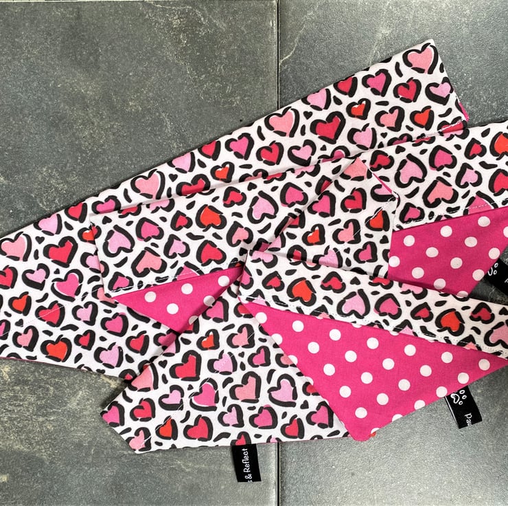 LOVE HEARTS BANDANA - A high quality, handmade, reversible & washable cotton bandana. It has a gorgeous heart motif on one side with a white spot on pink fabric on the reverse. It can be hand washed at 30 degrees. Sizes are an approximate measurement and are a guide to help you choose the best fit. This is a fun pet accessory so please make sure that it is suitable for your pet and check for wear and tear.