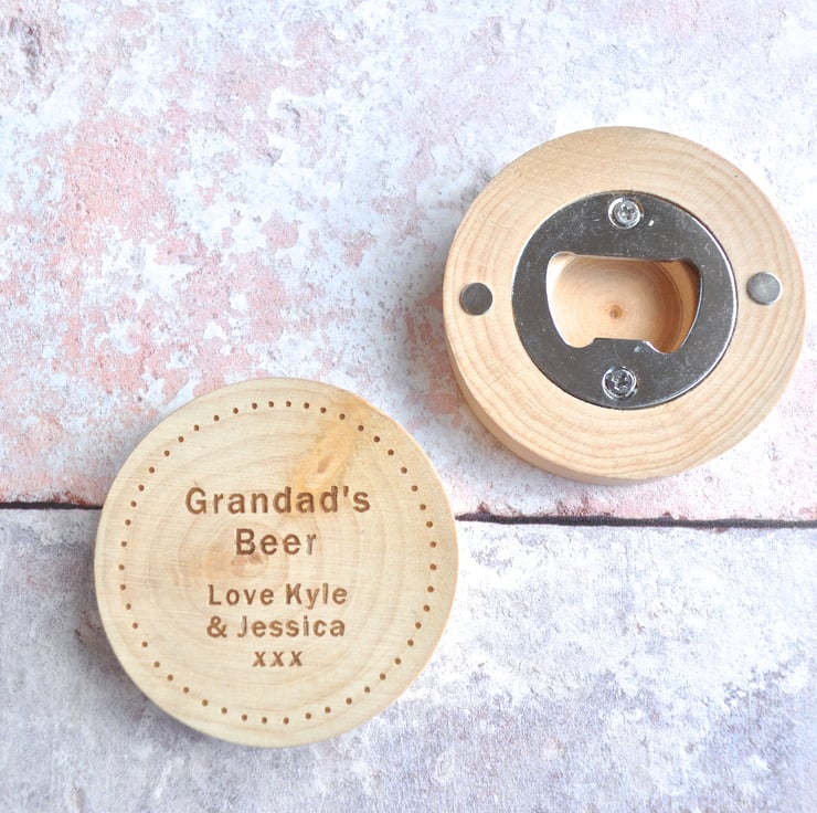 A personalised wooden pocket bottle opener complete with a magnetic back and personalised message ideal for your grandad this Father's Day.