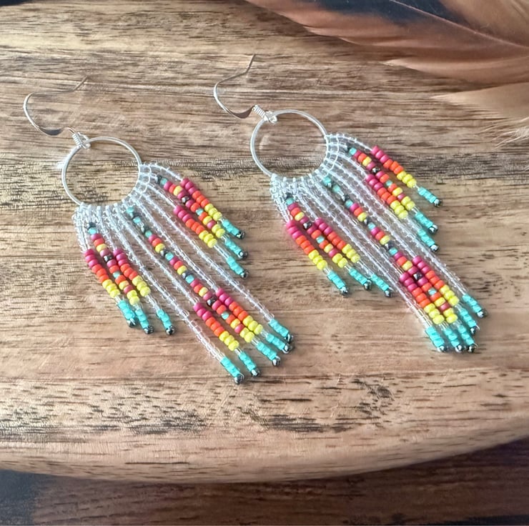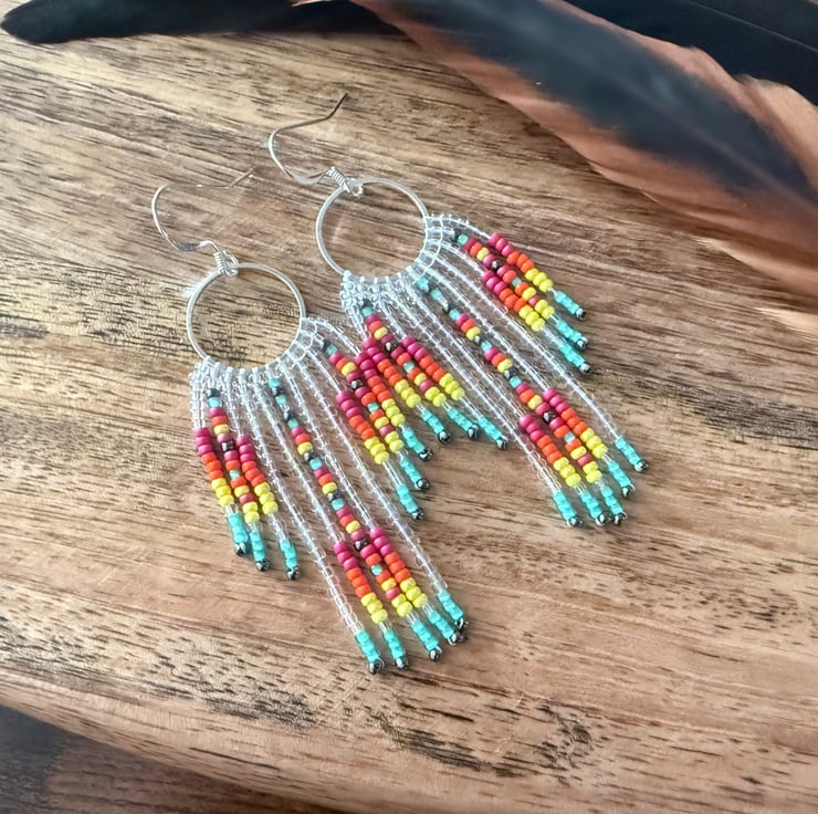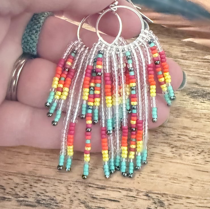 These bright and colourful, colour pop earrings have been handmade with Japanese Miyuki seed beads. The beads have been hand woven onto silver tone hoops in a frosted clear colour and hanging below is a beaded fringe that transitions into red, orange, yellow, turquoise and gunmetal grey colours. The design has been created by me and these earrings have a shorter fringe at the outer edges and a longer fringe in centre.