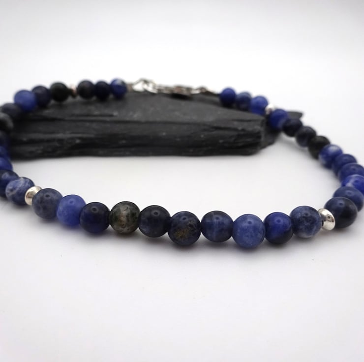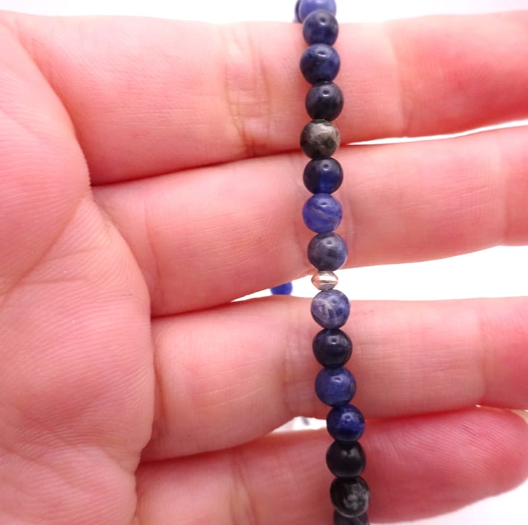 A beaded bracelet made with Sodalite gemstone beads and sterling silver beads.