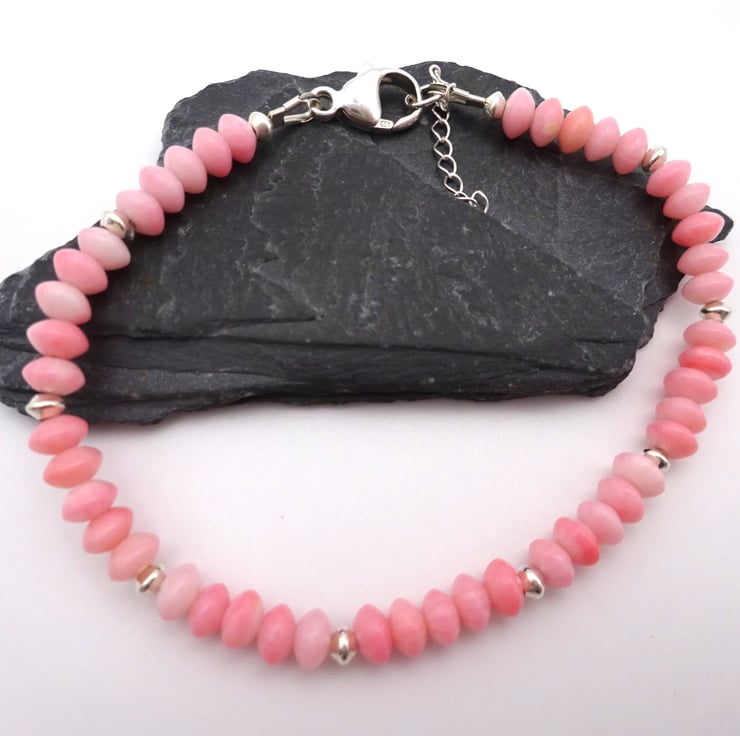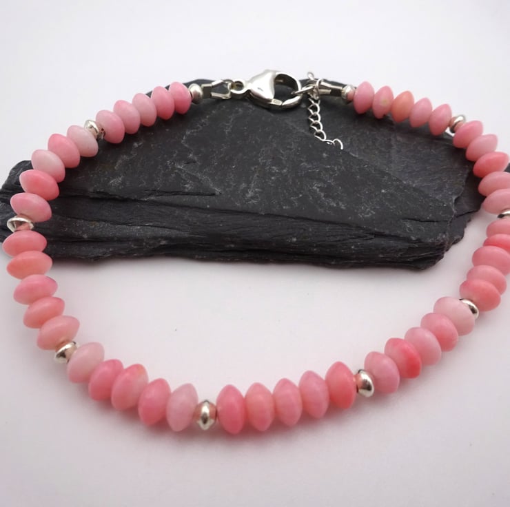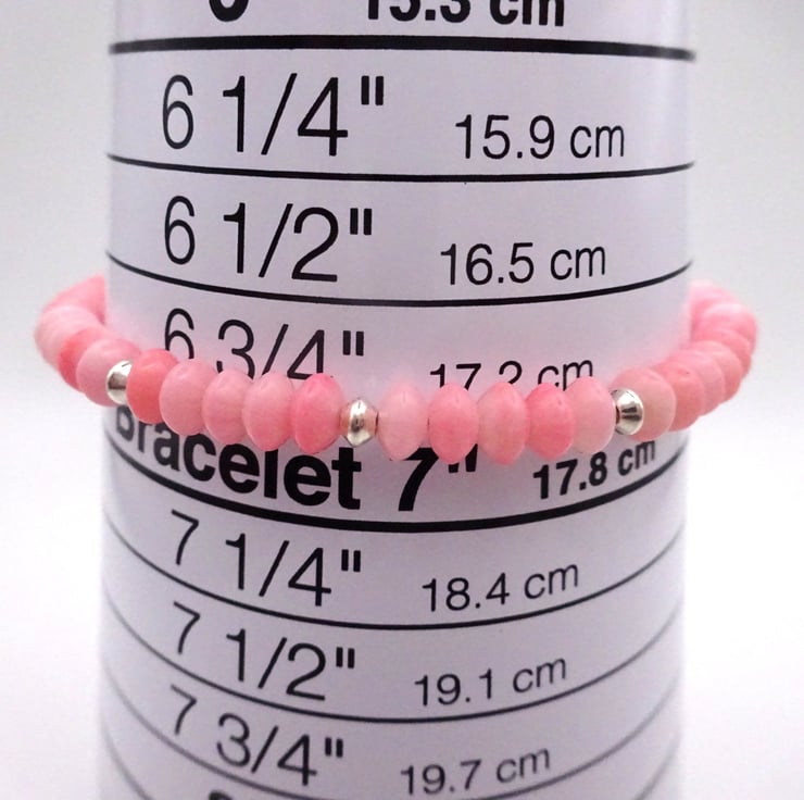 A beaded bracelet made with pink Bamboo Coral beads and sterling silver beads.