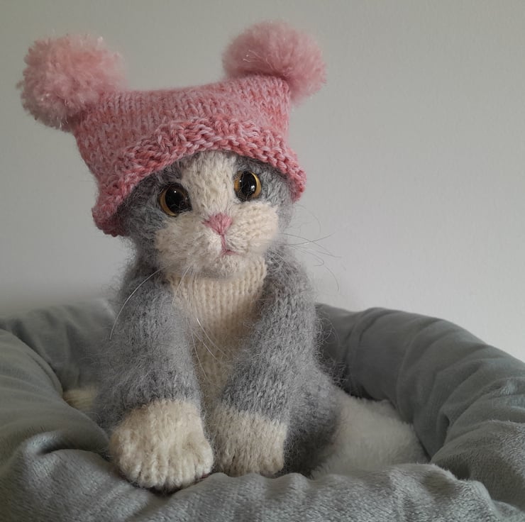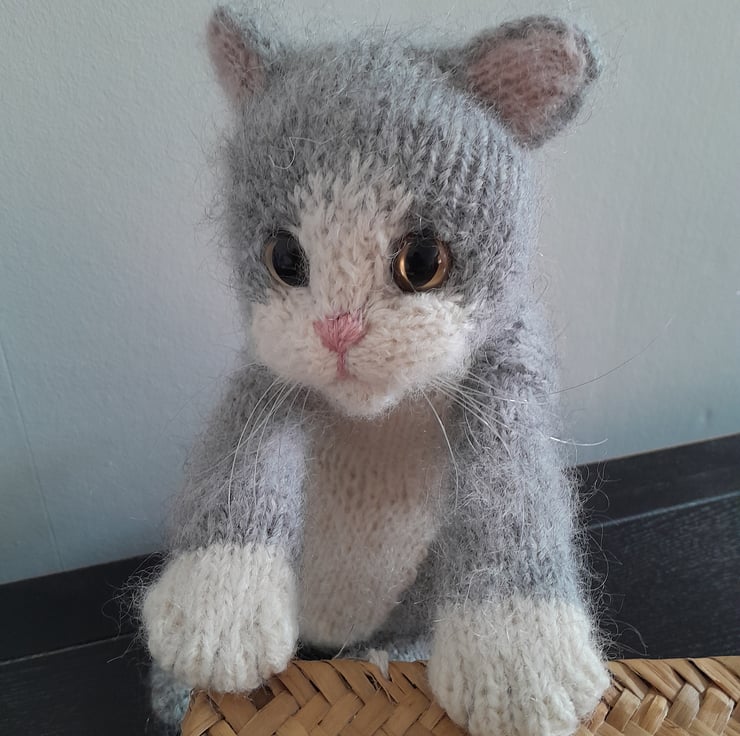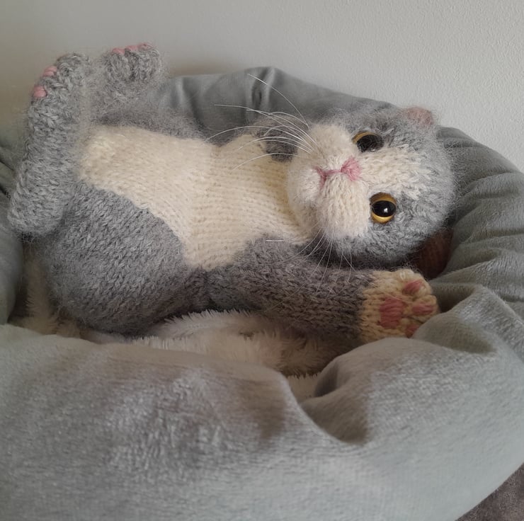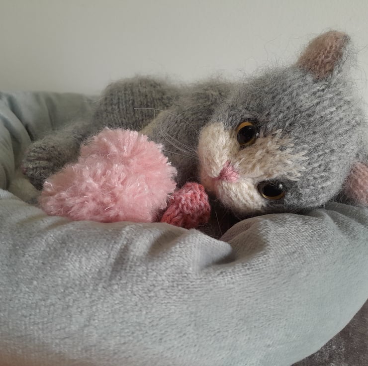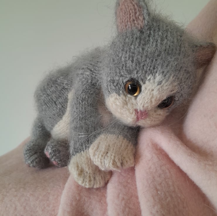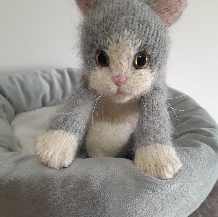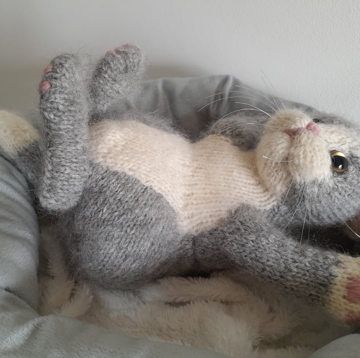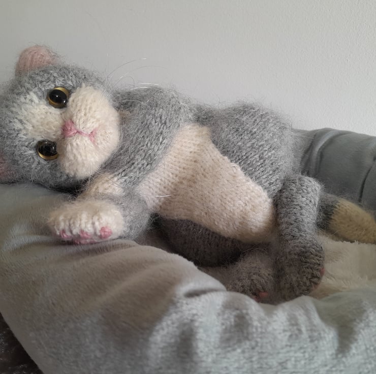 My grey kitty is based on a design by Claire Garland of dotpebblesknits a designer who creates wonderful realistic wild and domestic animals.