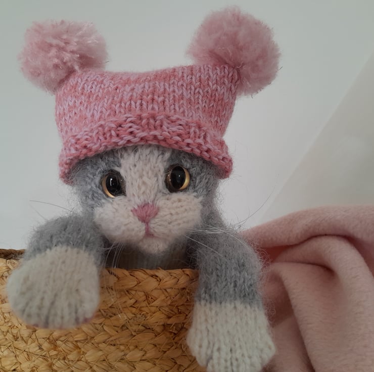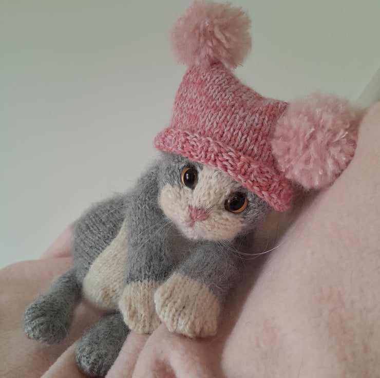 To keep her tiny ears warm she wears a fluffy mohair hat.