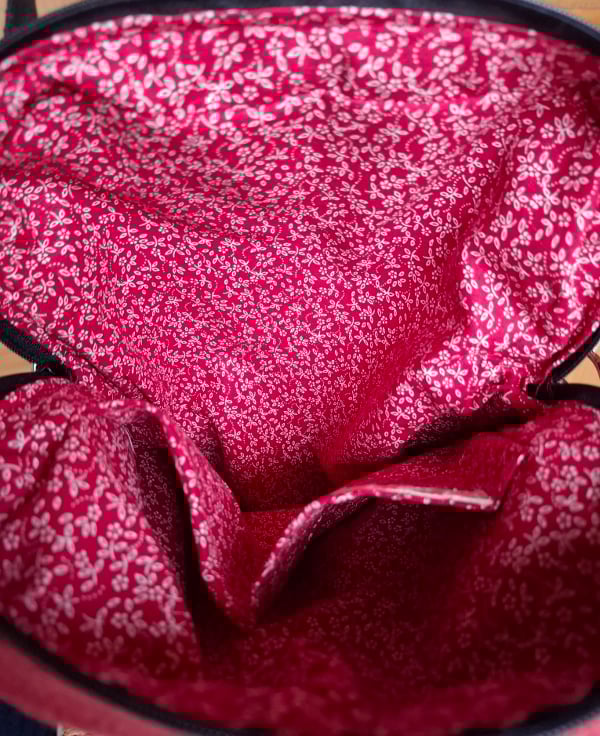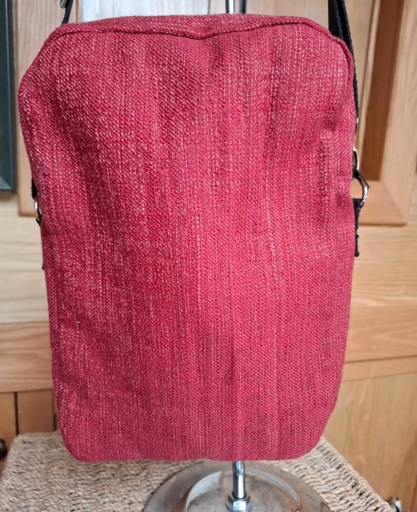 Red canvas weave crossbody bag. Zipped front pocket in a 'William Morris' print. Zipped main compartment lined in a cotton ditsy print, with inside pockets, and adjustable cotton webbing strap.