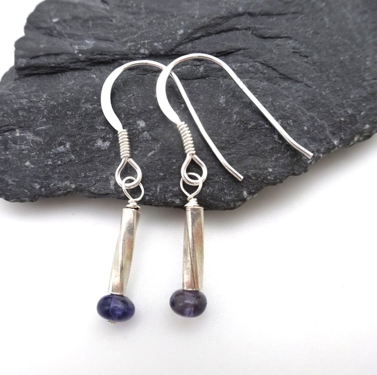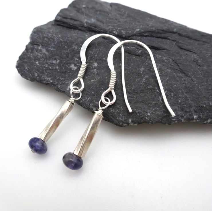 A pair of sterling silver earrings made with silver tubes and Grade AA Iolite gemstone beads.