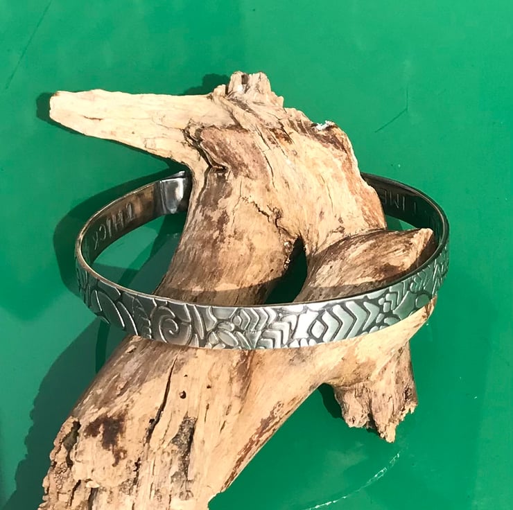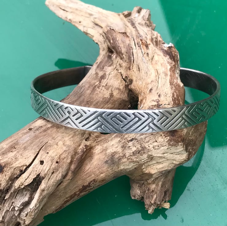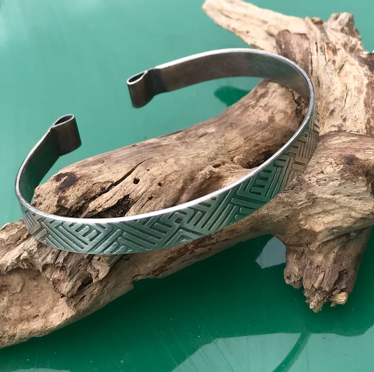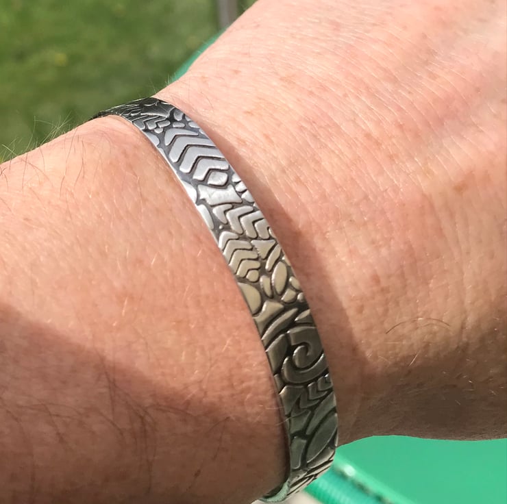 Patterned solid silver sterling bracelet made to order, finished with teardrop ends for maximum comfort. Available in bright polished finish or oxidised antique silver finish.