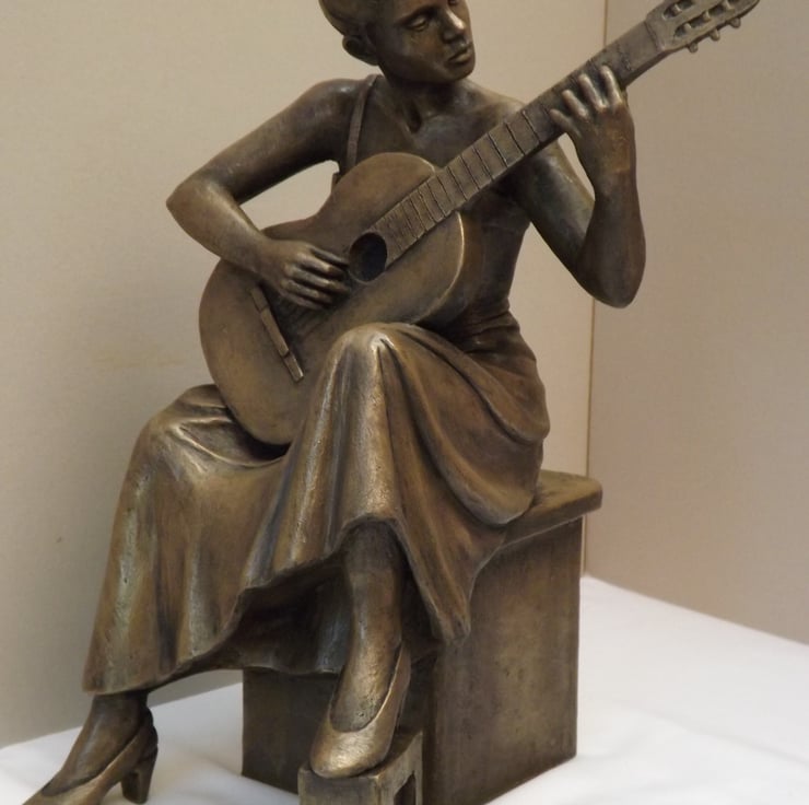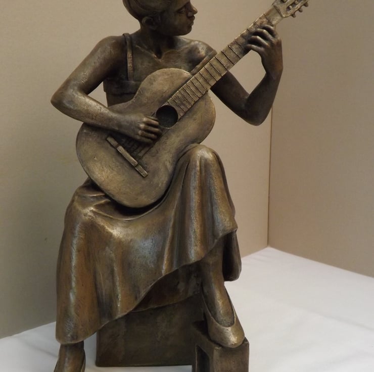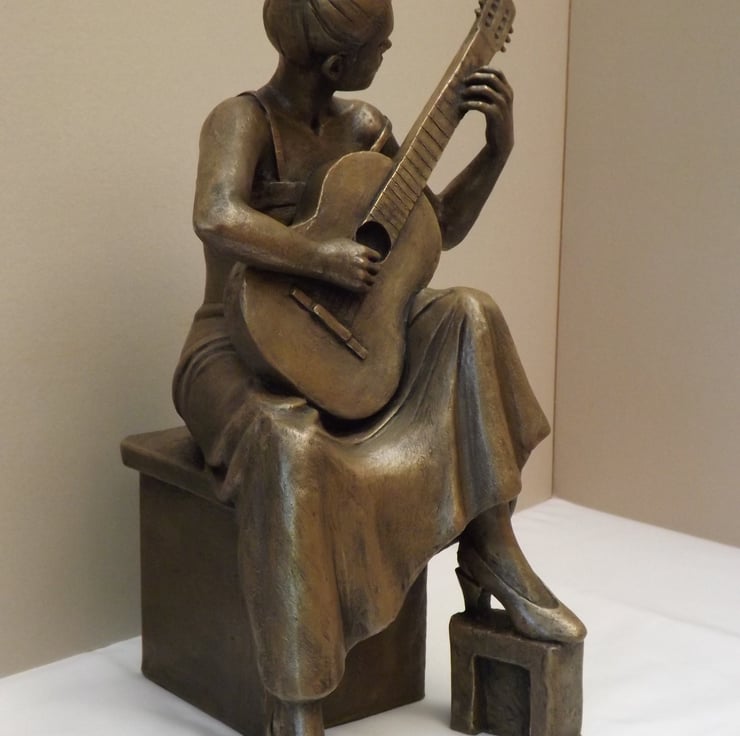 'Solo Performance' is a realistic sculpture of a young lady playing a guitar. She is concentrating hard on her finder positions.