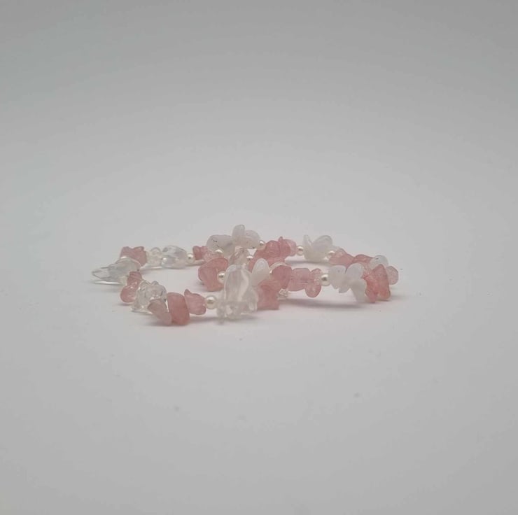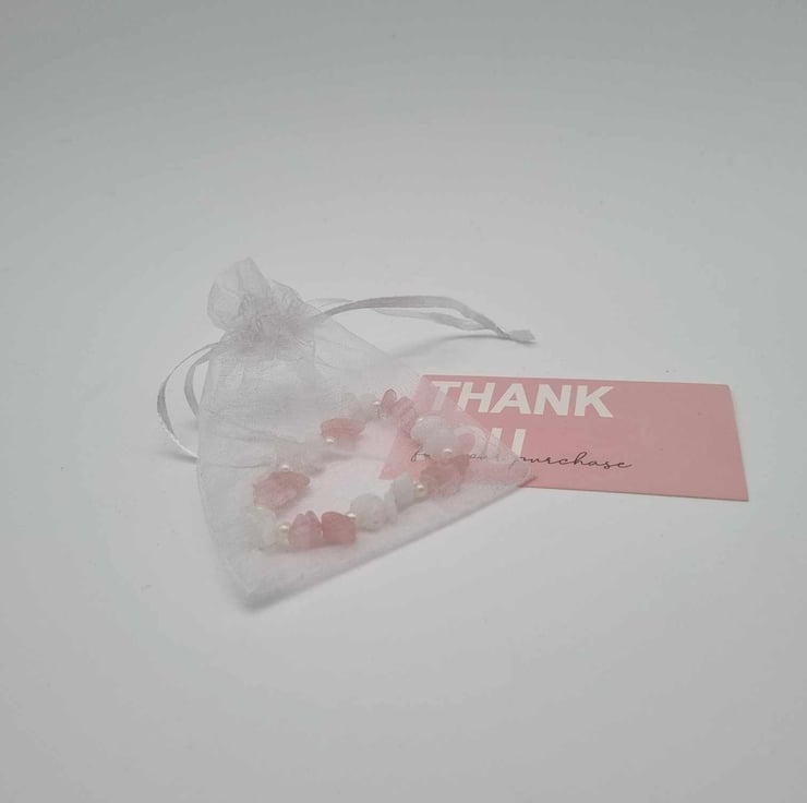 These bracelets come in two colour schemes (Pink and White or Pink and Transparent), which will come in an organza bag. This will then be in an envelope.