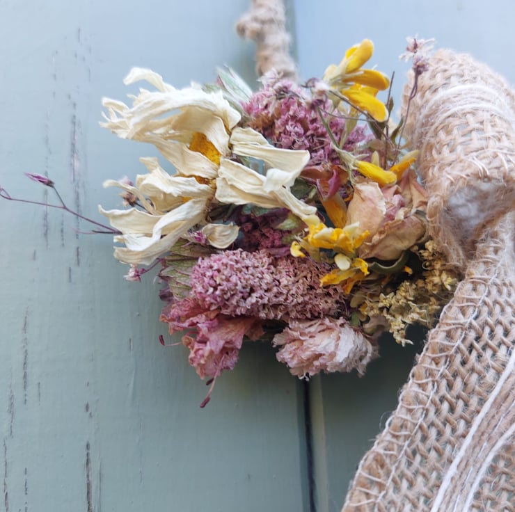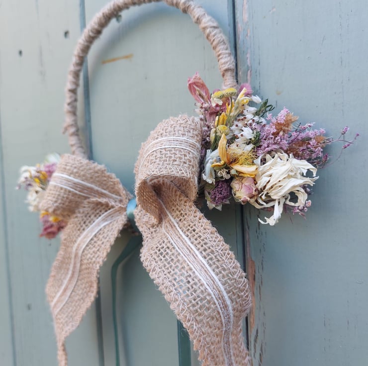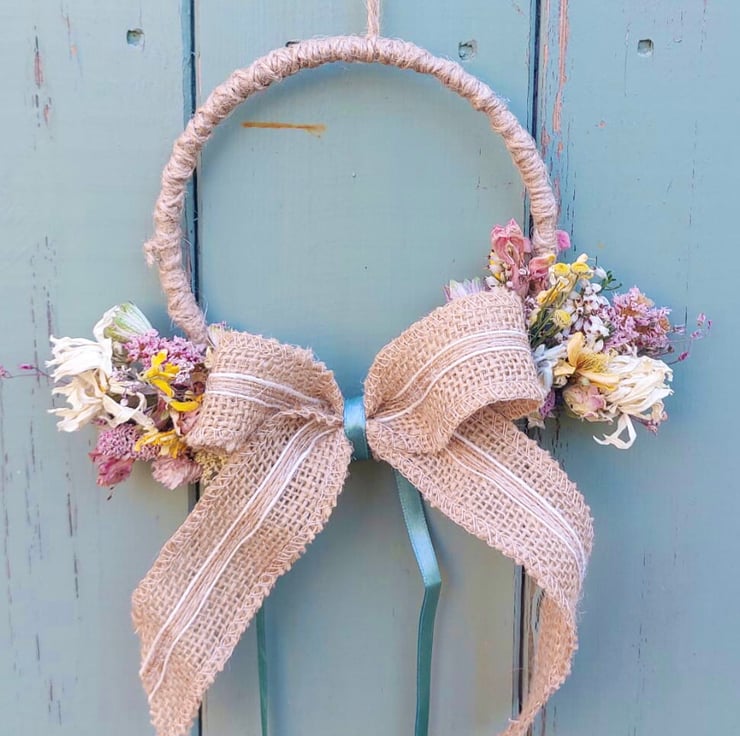 A handmade dried flower wreath decoration with a hessian bow at the centre.