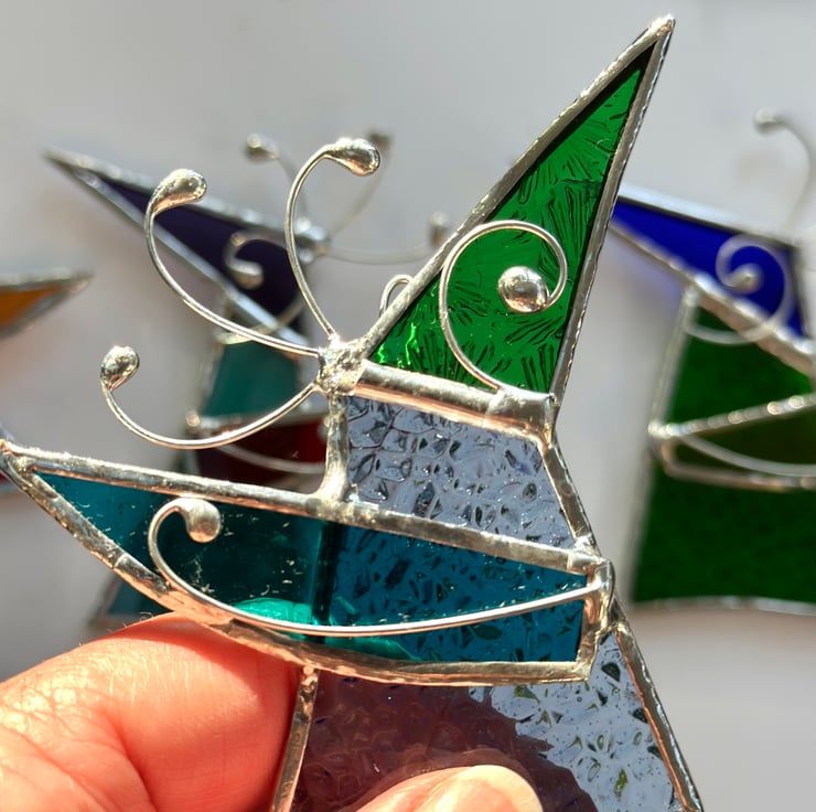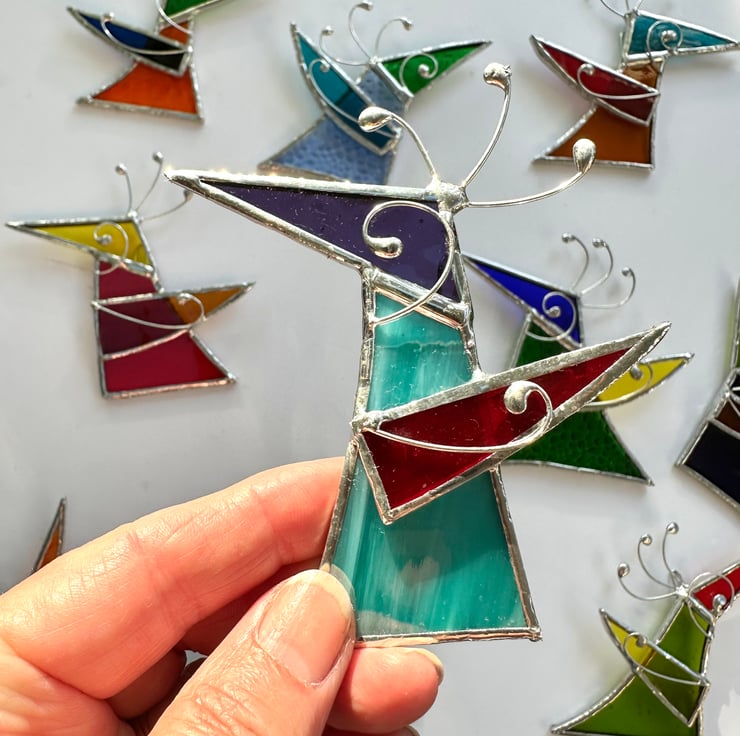 Each piece of glass has been cut by hand, ground, washed, foiled and soldered together. Detail for the eye, wing and head feathers have been made using tinned copper wire. A hook has been attached to the back and a length of line for hanging purposes.