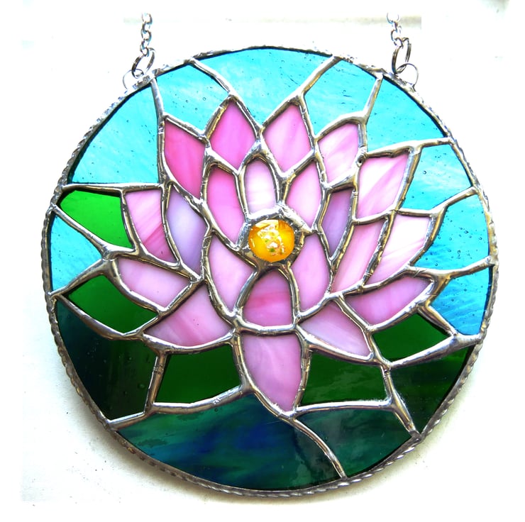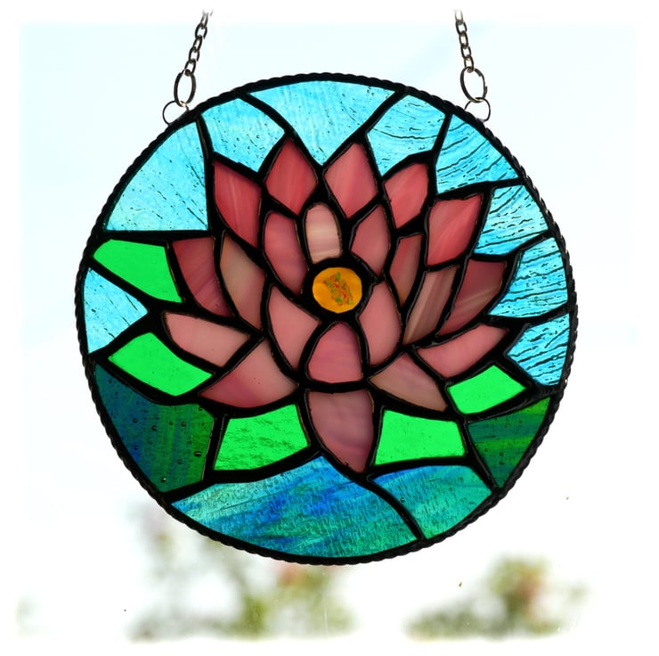My daughter suggested that the beautiful water lily flowering in my garden pond would make a good suncatcher. I designed this based on that flower and then gave it to my daughter for her birthday.