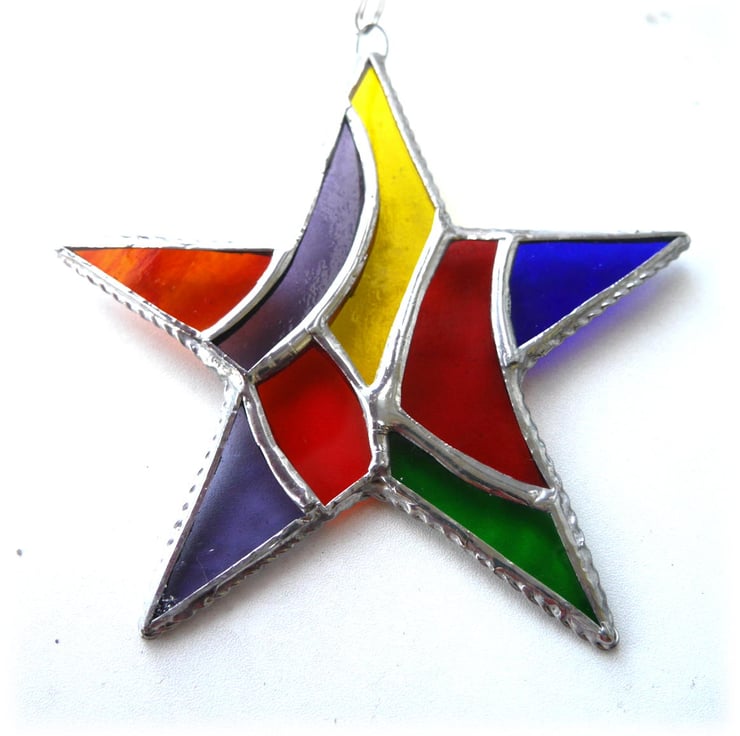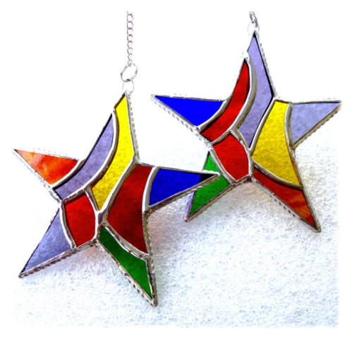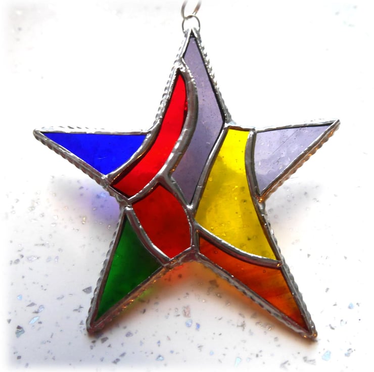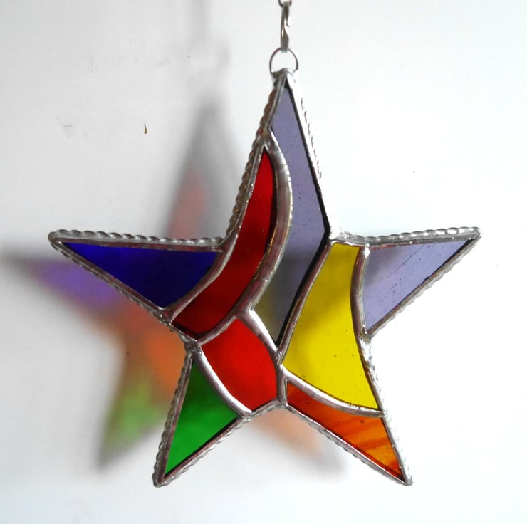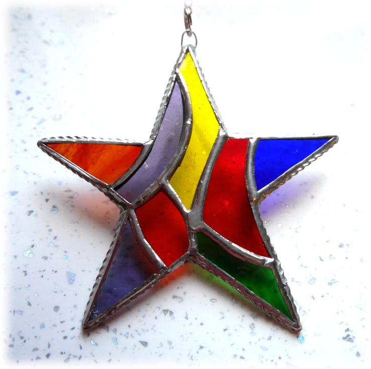 The star is 13 cm in diameter and hangs from a silvery chain attached via a soldered wire ring to the top of the star. I supply it with a suction pad so you can hang it in the window.